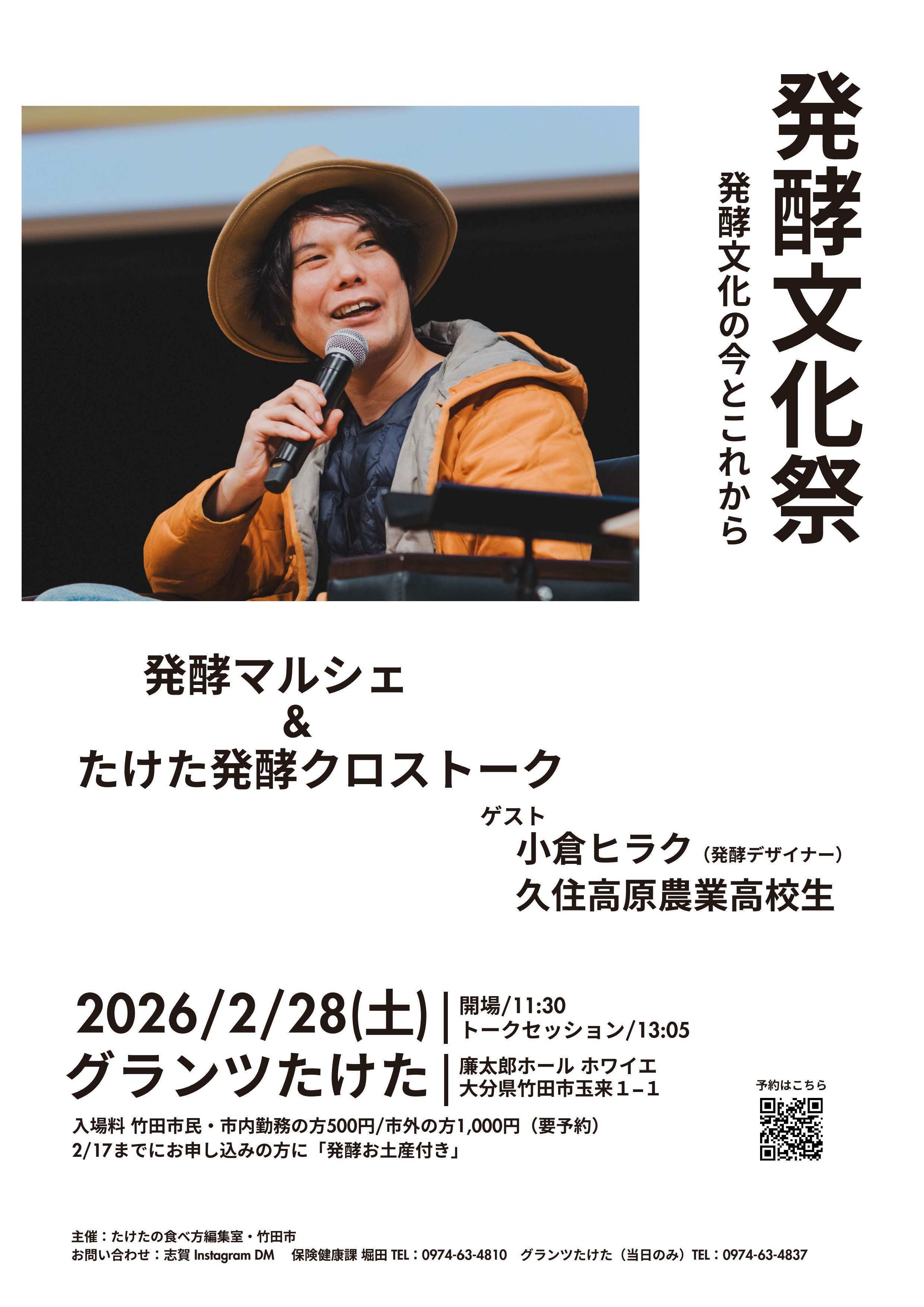 2026/02/10 18:45支援者の皆さまへいつも「おいしいたけた研究会」の活動を温かく見守り、力強く支えてくださり、誠にありがとうございます。皆さまからのご支援があったからこそ、私たちは地域の資源と向き合い、学び、考え、挑戦する時間を積み重ねてくることができました。このたび、2月28日(土)、たけたの食べ方編集室ならびに竹田市主催による「発酵文化祭」が開催されます。本イベントには、発酵デザイナーの小倉ヒラク さんをゲストとしてお迎えします。小倉さんは、味噌・醤油・日本酒・漬物など、日本各地に息づく発酵文化を、単なる「食」や「技術」としてではなく、土地の風土、歴史、人の営みと結びついた“文化”として捉え直し、現代に伝えてきた方です。全国の蔵や工房、地域の現場を自ら訪ね歩き、そこで働く人々の声や暮らしの背景に耳を傾けながら、「なぜ、この発酵はこの土地に残ってきたのか」「これから、どうすれば次の世代につないでいけるのか」という問いを投げかけ続けてこられました。その語りは専門的でありながらも平易で、発酵を「特別なもの」ではなく、私たちの暮らしのすぐそばにある、生きた文化として感じさせてくれます。当日のプログラムは、次の三部構成となっています。【第1部】「食と発酵の現在地」現代社会の中で、発酵はどのような意味を持ち、どのような価値を生み続けているのか。小倉さんより、全国の現場を見てきた視点から、今の時代における「発酵の現在地」を語っていただきます。【第2部】「高校生たちと発酵」久住高原農業高校「おいしいたけた研究会」のメンバーをはじめとした生徒たちが、これまで取り組んできた活動や、10代ならではの率直な疑問・迷い・挑戦の途中にある思いを、小倉さんに直接投げかけるクロストークを行います。これは、皆さまのご支援によって育まれてきた学びが、社会とつながり、対話へとひらかれる瞬間でもあります。【第3部】「竹田の発酵文化の今とその先」竹田に根づいてきた発酵文化をあらためて見つめ直し、これからの時代に、どのように手渡していくのか。地域の未来について、参加者全員で語り合います。この一日は、支援 → 学び → 対話 → 次の挑戦という循環が、確かに形になる時間です。ご都合がよろしければ、ぜひ会場に足をお運びいただき、対話の場をご一緒いただけましたら幸いです。改めまして、皆さまのご支援に心より感謝申し上げます。これからも、おいしいたけた研究会は、地域の皆さんとともに、ゆっくりでも確かな歩みを続けてまいります!!! もっと見る