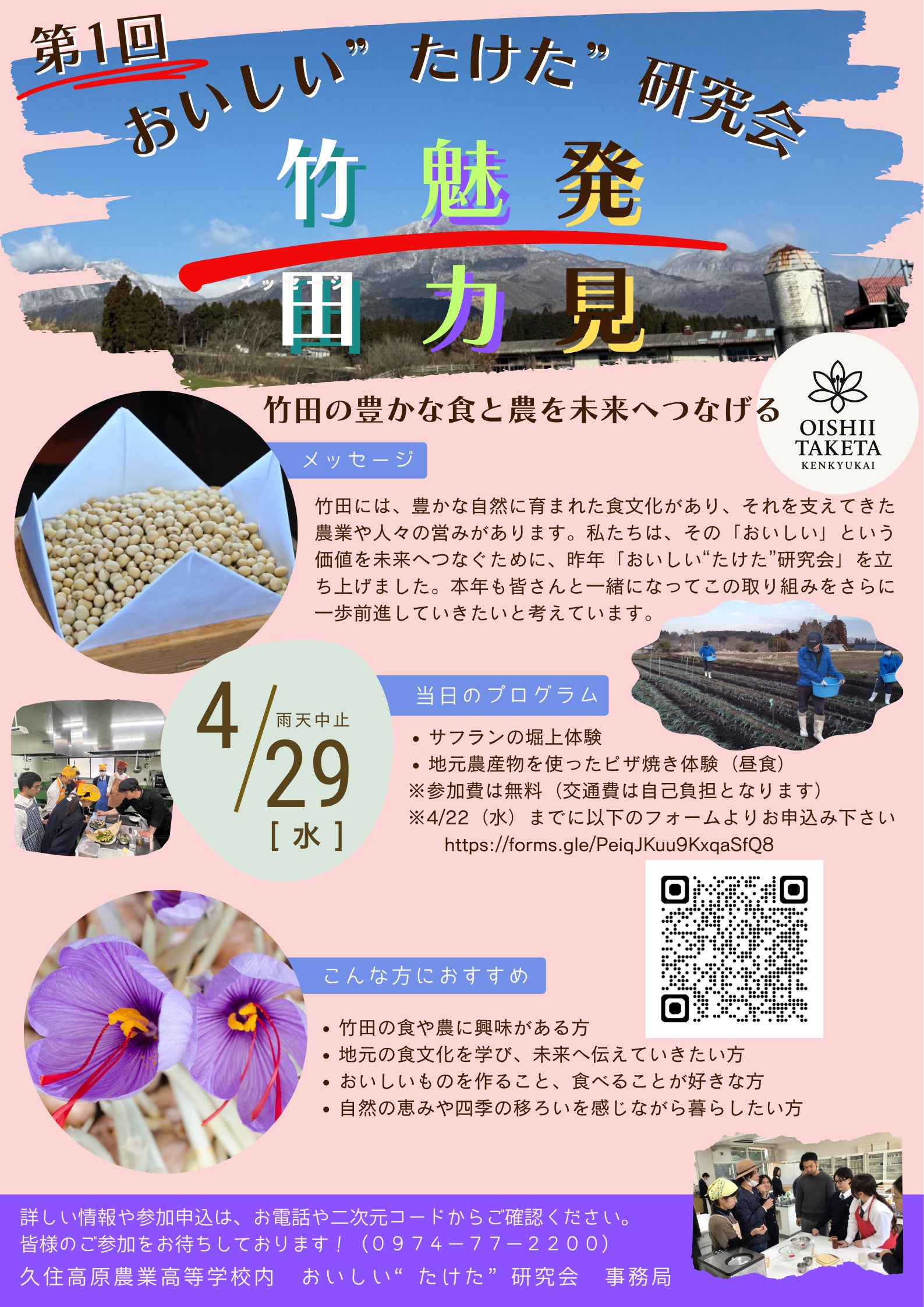 2026/04/16 08:00クラウドファンディングでのあたたかいご支援、誠にありがとうございます。皆さまの応援を力に、今年度も「おいしい“たけた”研究会」の活動をスタートいたします。この研究会では、竹田の食の魅力を学び・体験しながら、多世代・多立場で交流を育んでいくことを目指しています。そして、いよいよ第1回目の活動を4月29日(水)に開催いたします!【開催概要】日 時:令和8年4月29日(水)10:00~13:30(受付:9:30~)場 所:久住高原農業高校内 容:①サフランの堀上体験 ②地元農産物を使ったピザ焼き体験(昼食)持ち物:作業服、長靴、帽子、手袋、タオル、水筒交通費:誠に恐縮ですが、交通費は自己負担にてお願いいたします※雨天等で中止の場合は前日までにご連絡します※参加・入会は無料です。下記フォームからお申し込みいただけます※4/22(水)までに入力いただけると幸いです【第1回参加申込フォーム】https://forms.gle/PeiqJKuu9KxqaSfQ8今後もこの活動の経過を、随時ご報告してまいります。応援してくださった皆さまと「おいしい」を共有できる場として、心を込めて準備を進めております。【お問合せ先】おいしい“たけた”研究会 事務局(久住高原農業高校内・田尻)TEL:0974-77-2200Mail:tajiri-yoshitaka@oen.ed.jp もっと見る