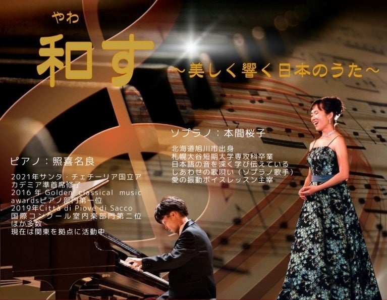 コンサートを彩るのは、札幌を拠点に活動するソプラノ歌手の本間桜子さんと、イタリアをはじめ世界各国で研鑽を積んだ国際派ピアニストの照喜名良さんです。