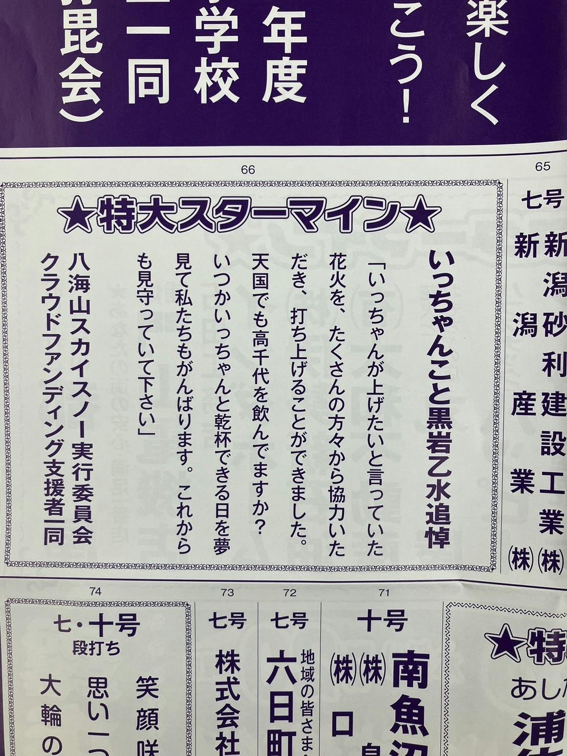 2025/07/10 14:13クラウドファンディングでご支援いただいた皆さまへいよいよ「黒岩乙水追悼花火」の打ち上げが7月20日(日)20時〜に迫ってまいりました。「いっちゃんが見たいと言っていた花火を打ち上げたい」その想いに共感し、たくさんのご支援をいただきました。おかげさまで、天国でもきっと高く届くような、大きなスターマインを打ち上げることができます。今回の花火には、皆さまからの応援とともに、「いつちゃん、見ていてね」という気持ちを込めて夜空に届けたいと思います。八海山スカイスノー実行委員会・クラウドファンディング支援者一同として、花火大会のプログラムにもその想いを込めたメッセージが掲載されました(※写真参照)。当日は、どうかそれぞれの場所から夜空を見上げて、あたたかな気持ちを共有していただけたら嬉しいです。なお、次回の「八海山スカイスノー」は令和8年2月28日(金)開催予定です!引き続き、地域を盛り上げるチャレンジを一緒に続けてまいりましょう!心からの感謝を込めて。八海山スカイスノー実行委員会 もっと見る