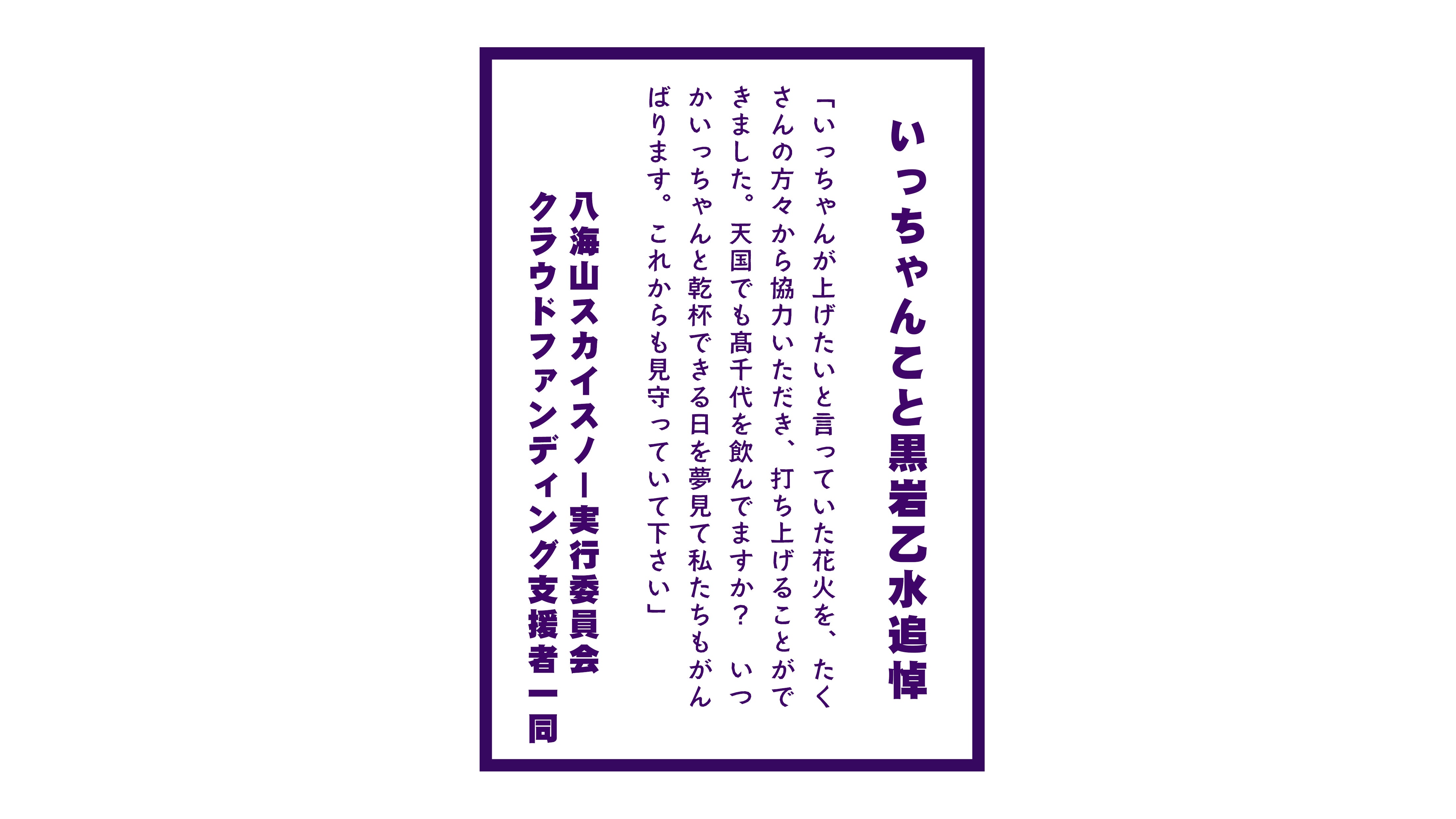 2025/07/10 14:13クラウドファンディングでご支援いただいた皆さまへいよいよ「黒岩乙水追悼花火」の打ち上げが7月20日(日)20時〜に迫ってまいりました。「いっちゃんが見たいと言っていた花火を打ち上げたい」その想いに共感し、たくさんのご支援をいただきました。おかげさまで、天国でもきっと高く届くような、大きなスターマインを打ち上げることができます。今回の花火には、皆さまからの応援とともに、「いつちゃん、見ていてね」という気持ちを込めて夜空に届けたいと思います。八海山スカイスノー実行委員会・クラウドファンディング支援者一同として、花火大会のプログラムにもその想いを込めたメッセージが掲載されました(※写真参照)。当日は、どうかそれぞれの場所から夜空を見上げて、あたたかな気持ちを共有していただけたら嬉しいです。なお、次回の「八海山スカイスノー」は令和8年2月28日(金)開催予定です!引き続き、地域を盛り上げるチャレンジを一緒に続けてまいりましょう!心からの感謝を込めて。八海山スカイスノー実行委員会 もっと見る