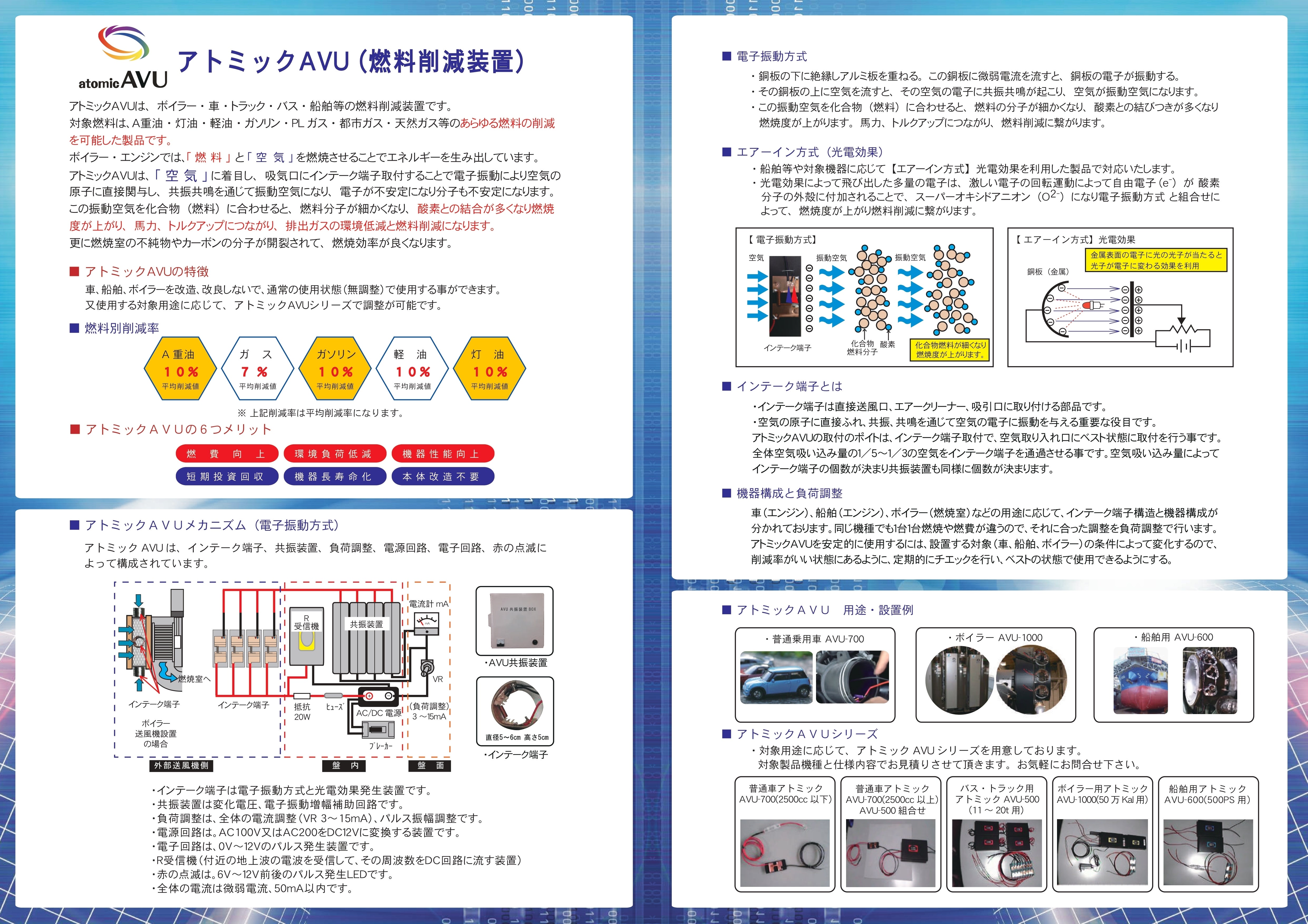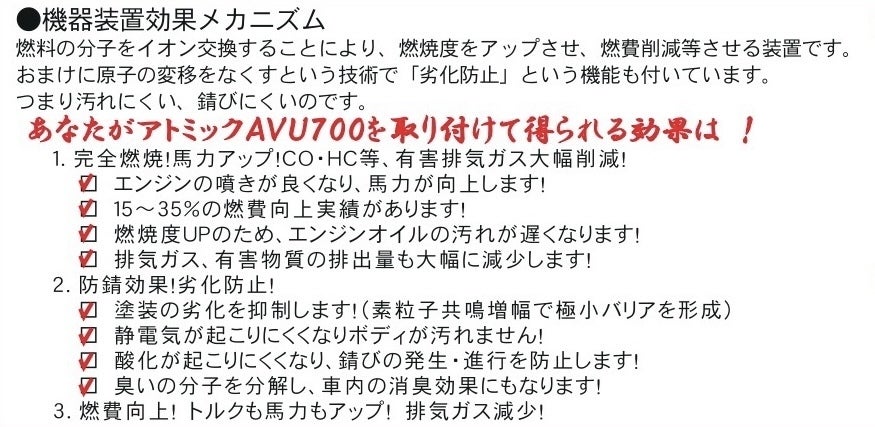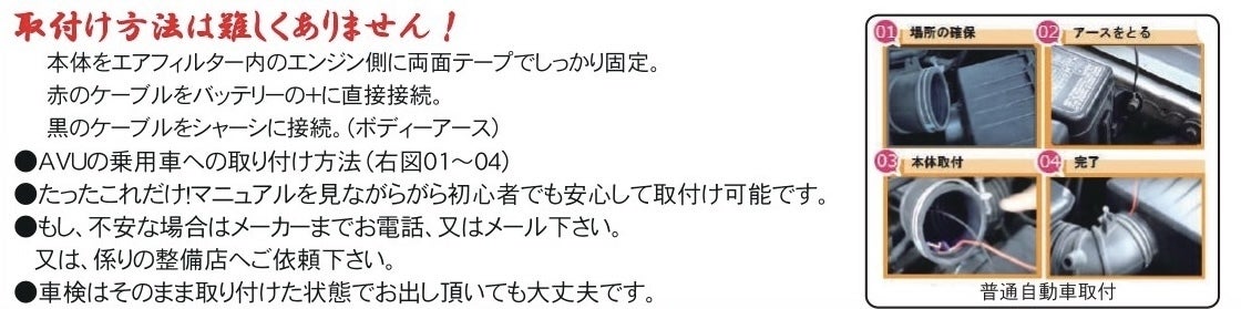 また、当製品は、内燃機関そのものに直接アプローチする装置ではなく、入り口である吸気口から取り入れる空気の【質】を向上させる製品の為、【機構自体の改造】等には該当せず、自動車で例えますと、シガライターから電源を供給して取り付けるような【電装品】と同じ扱いですので、ご導入先様のどのようなご利用条件下でも安心してご使用いただけます。