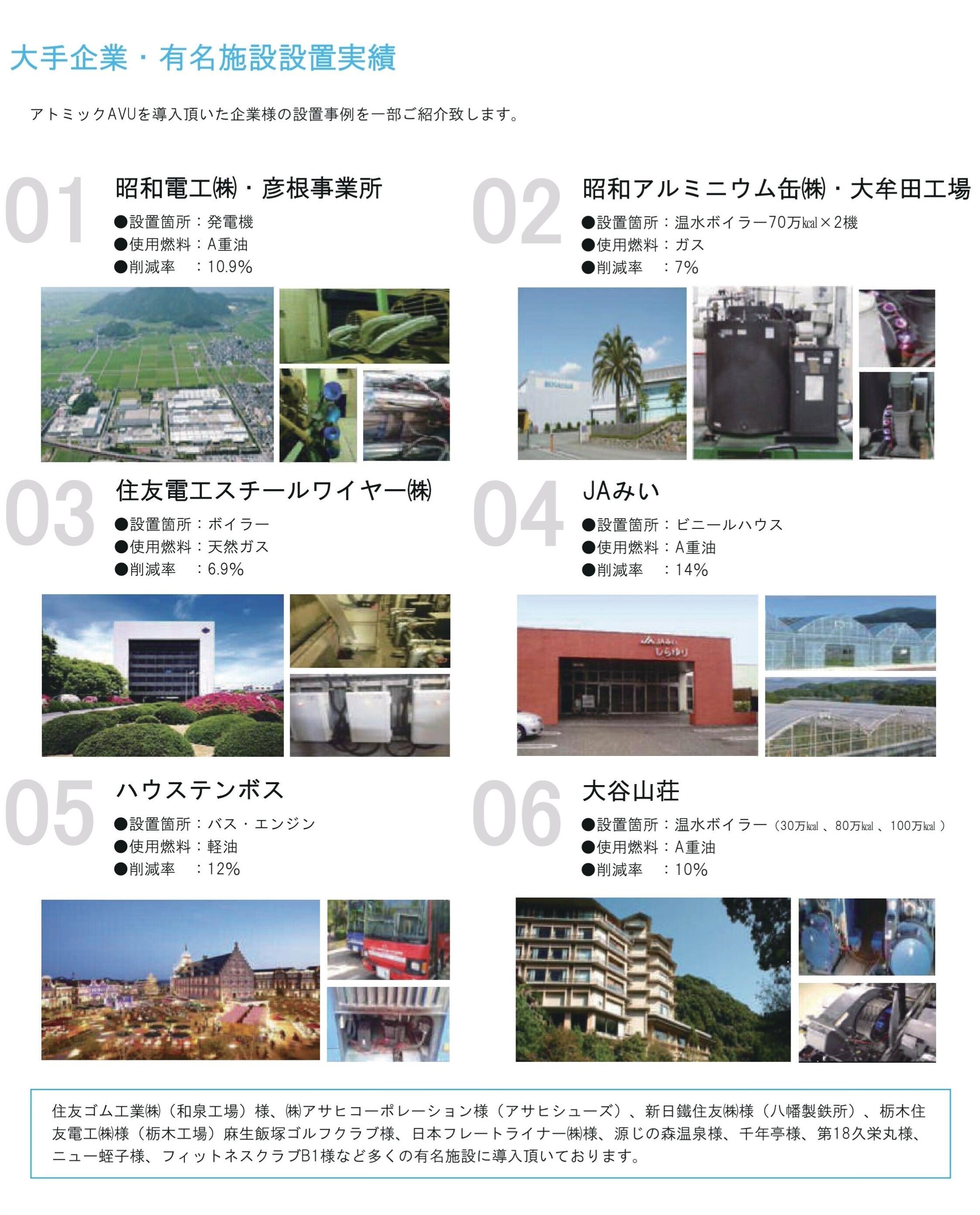 当製品については、既に20年弱の販売・取付実績(メーカー発表)があり、大手企業様ですと、住友電工㈱様(ボイラー)、昭和電工㈱様(発電機)、ハウステンボス様(バス)等の多くの企業様、また、ホテル、スーパー銭湯や、運送会社(タクシー事業者含む)、フィットネスクラブ、コインランドリー等の多岐に渡る業種でご利用をいただいております。