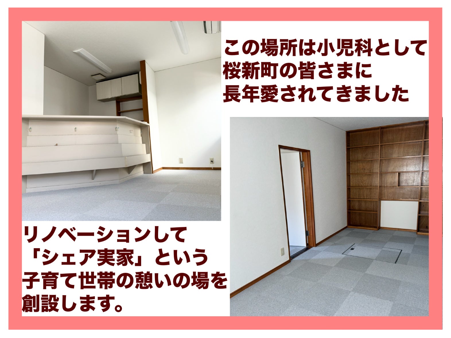 今回のプロジェクトでいただいたお金をもとに、元小児科の物件をリノベーションします!支援いただいた方にも色々と意見をいただきながら素敵な空間づくりができればと思います。周りの方へのご紹介・ご支援のほどどうぞよろしくお願いいたします!