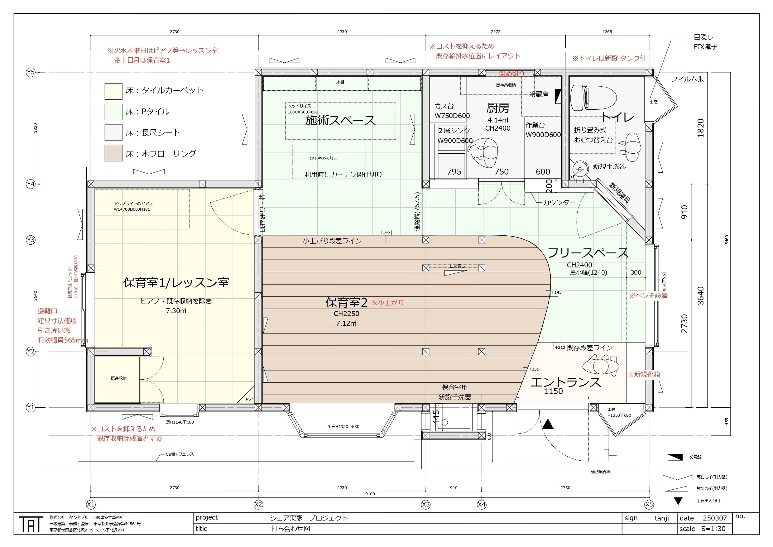 これまで小児科として使われてきた物件で、この物件や内装に愛着のある方も多いかと思います。残せる部分は残しながら、保育室として機能させるための2方向避難の手段など、安全性を一番に、実用性とデザイン性のバランスをとりながら進めています。