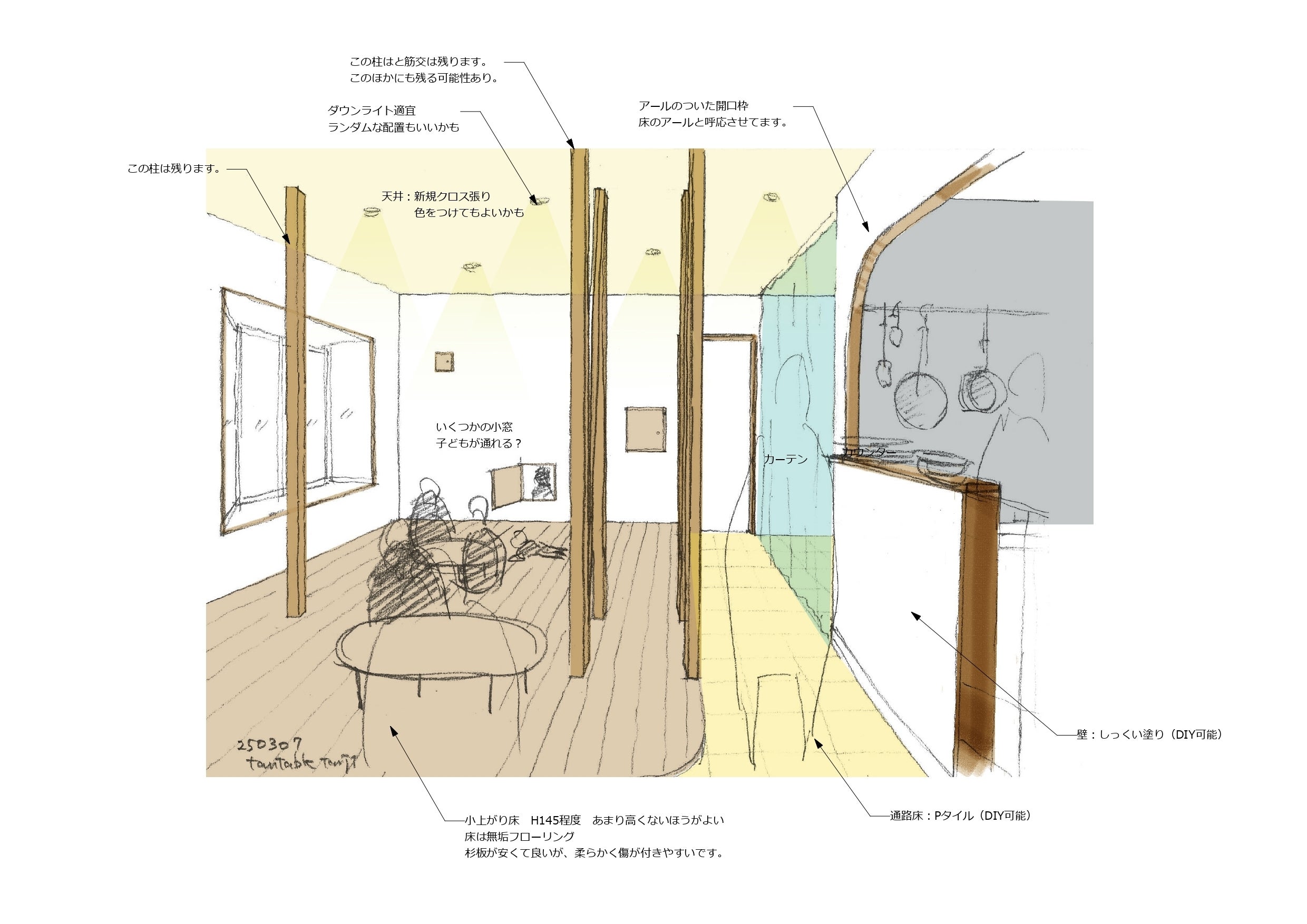 小上がりでくつろげるスペースを十分にとりつつ、習い事やワークショップで使えるスペースも確保します。ここで何をやろうか、どんな空間をつくろうか、考えるだけでわくわくしませんか…?