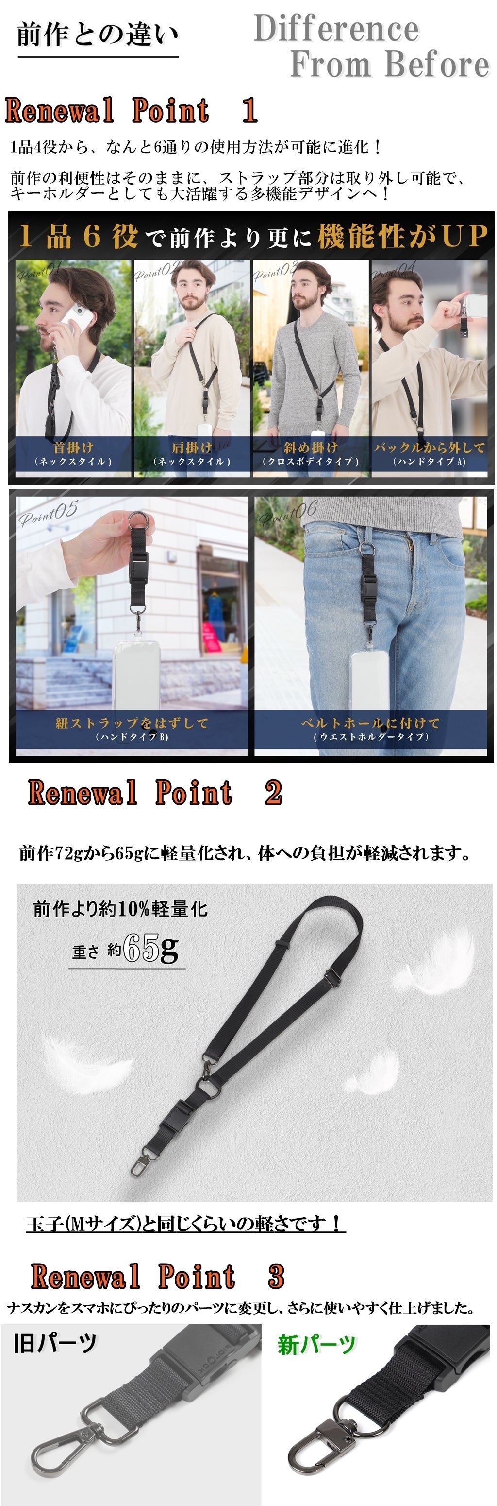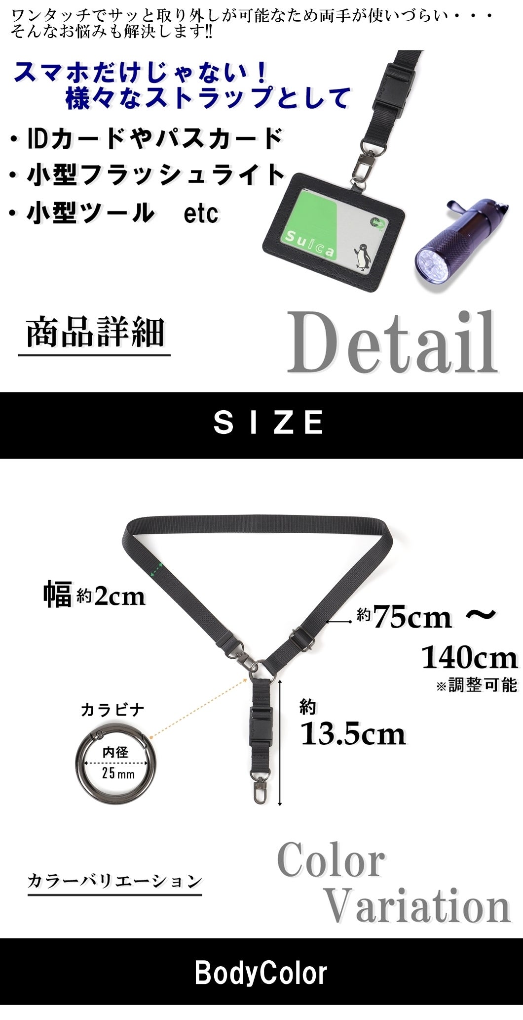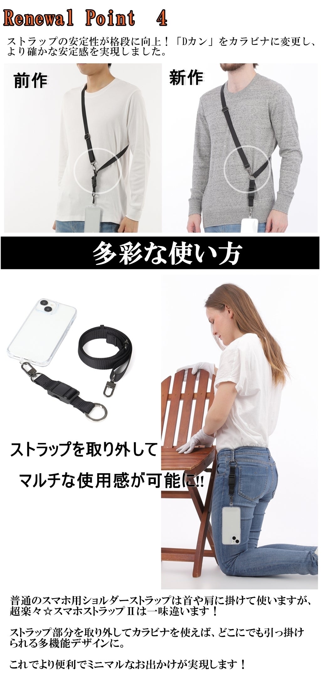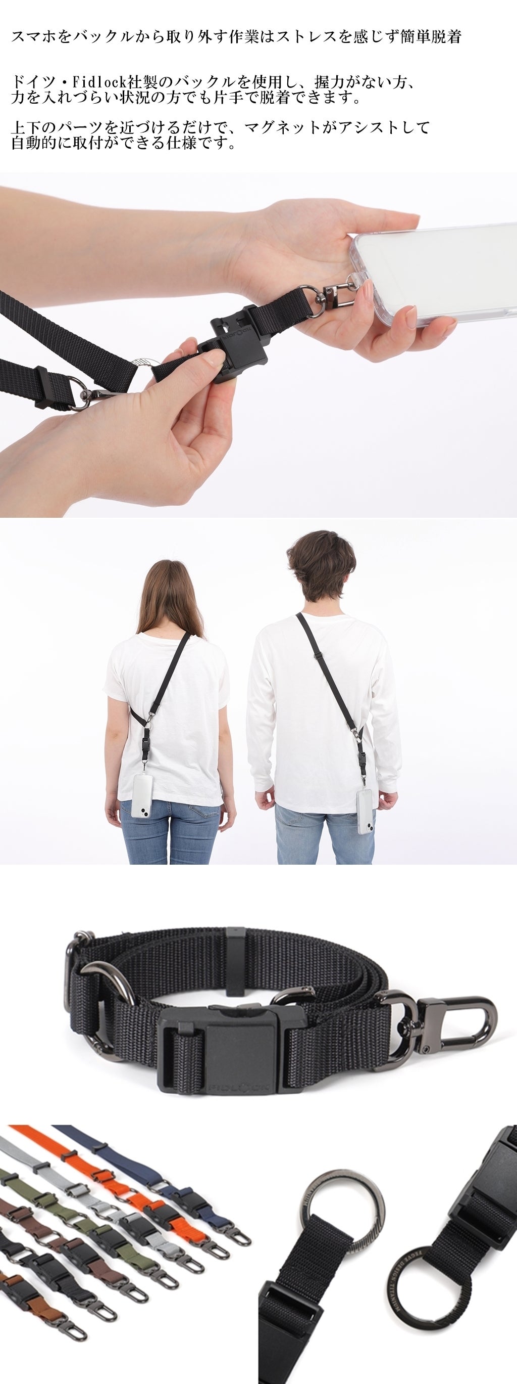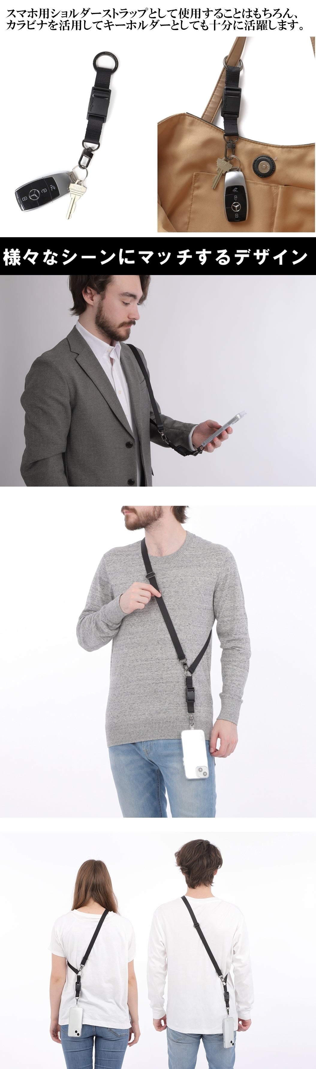 これにより、スマホをもっと便利に、もっと快適にお使いいただけます。この新商品は、スマホ用ショルダーストラップとしてだけでなく、カラビナを活用してキーホルダーとしても十分に活躍します。