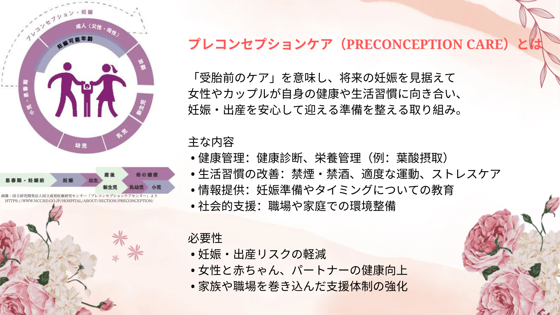 私が現在学んでいる「プレコンセプションケア(PCC)」は、将来の妊娠を考えながら女性やカップルが自分たちの生活や健康に向き合うことです。(国立成育医療研究センター)しかし、日本ではまだ十分に普及しておらず、国内初のプレコンセプションケアの教科書が出版されたのも2024年と、新しい分野です。