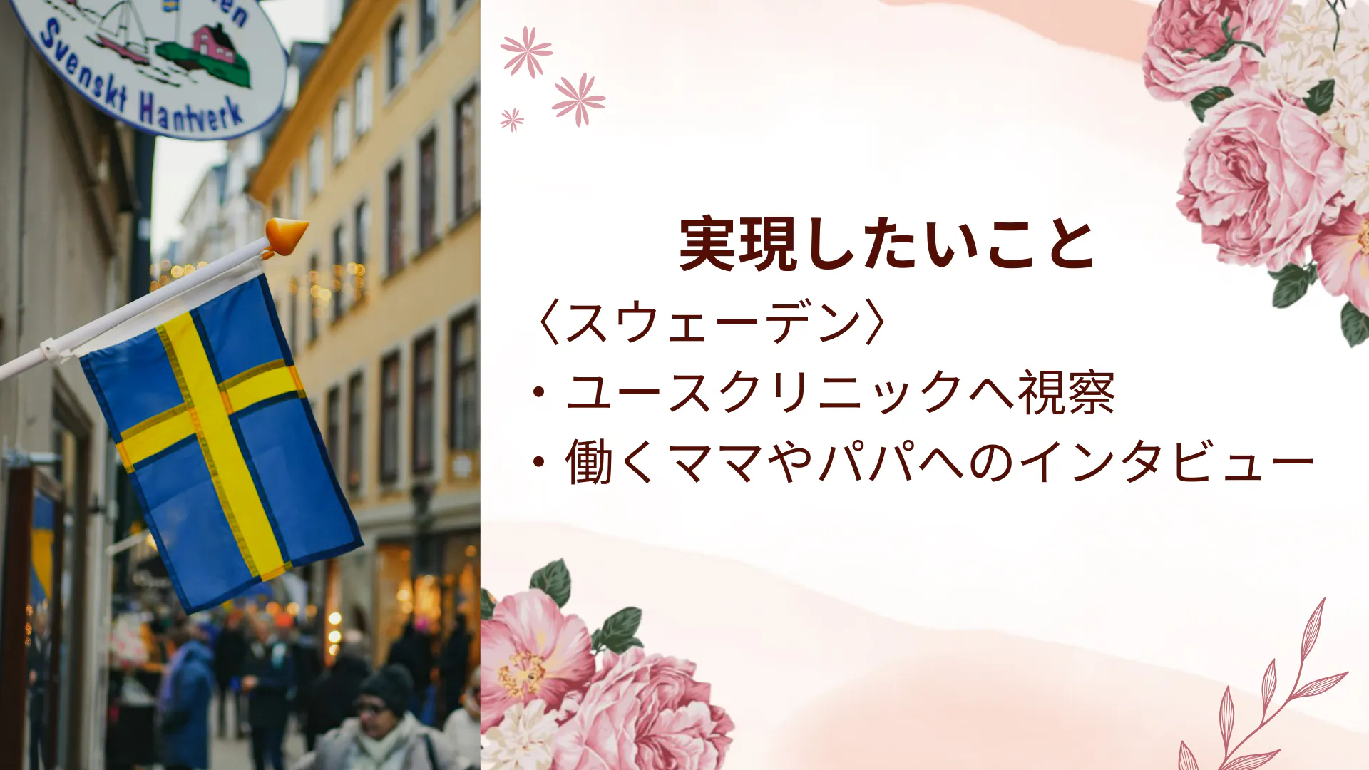 スウェーデンでのインタビューを通じて、働く世代の妊娠・出産支援について調査します。