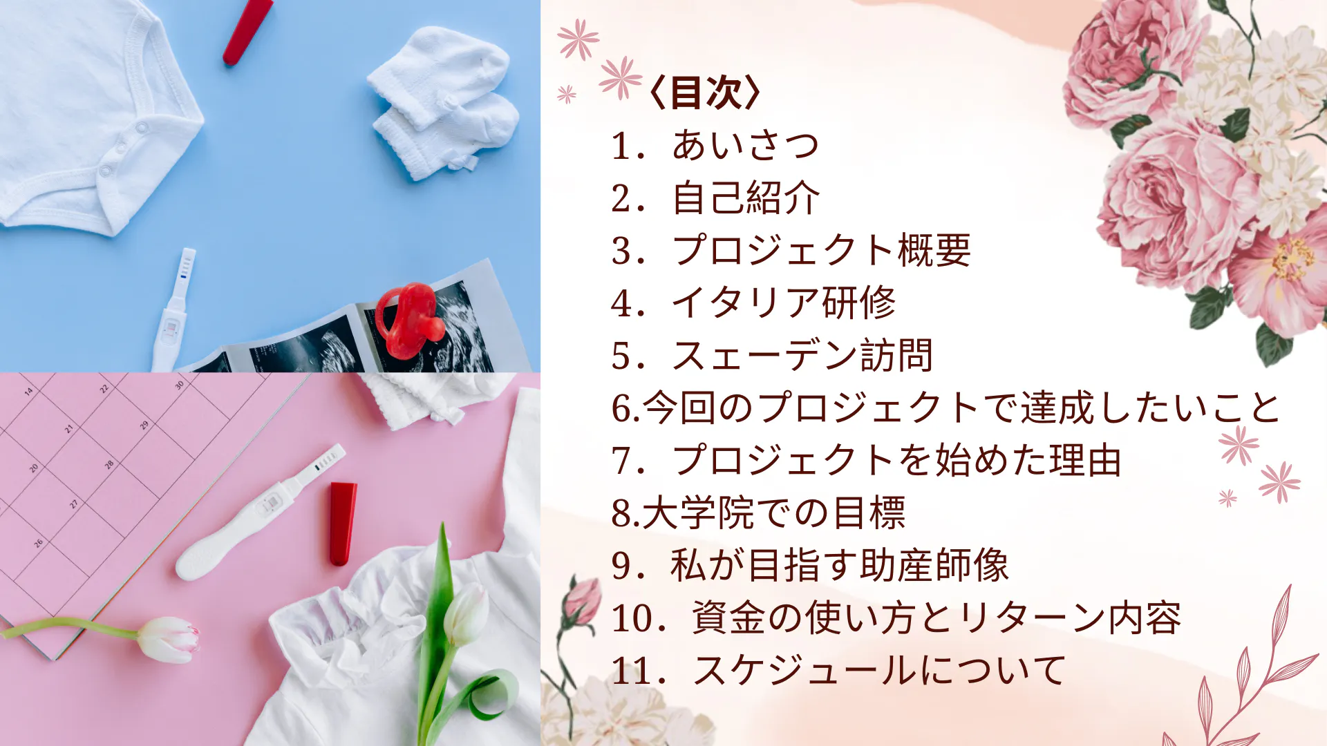 イタリアでの研修を活用し、若者の性教育やプレコンセプションケアへの関心を調査します。
