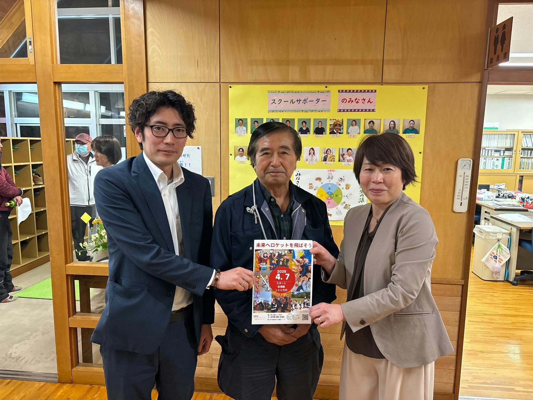今回は、PTA会長さんと区長さんと私の3ショット。PTA会長さんもいろいろな場所でクラウドファンディングを宣伝し広めてくれています。私の見えないところで、みんなで階上小の子どもたちのことを考え支援してくださっていることを感じています。