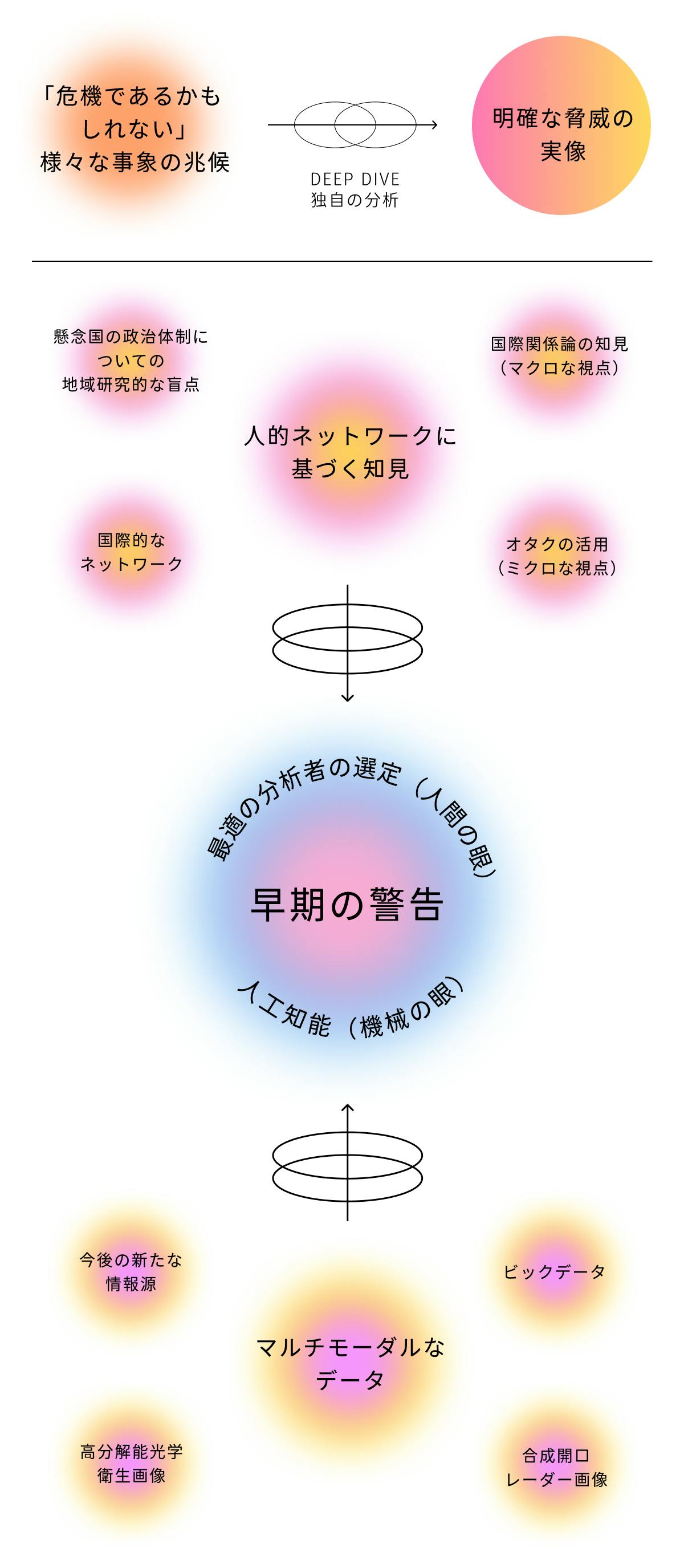 DEEP DIVEはデジタル公開情報インテリジェンス(OSINT)と衛星情報インテリジェンスにより、日本社会にとって必要な警告をいち早く届けることをミッションとしています。