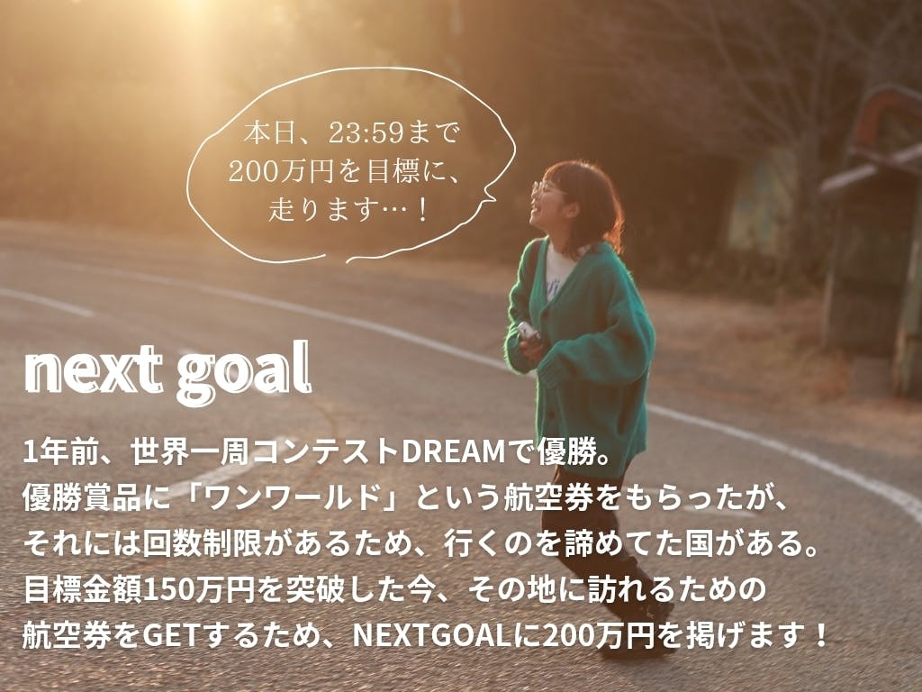 今、159万円となった総支援額を見ても、まだ現実味が正直なくって。だけど、ここまで沢山の人に励まされ、支えられながら歩いてきたことだけはこの身を持って実感しています。