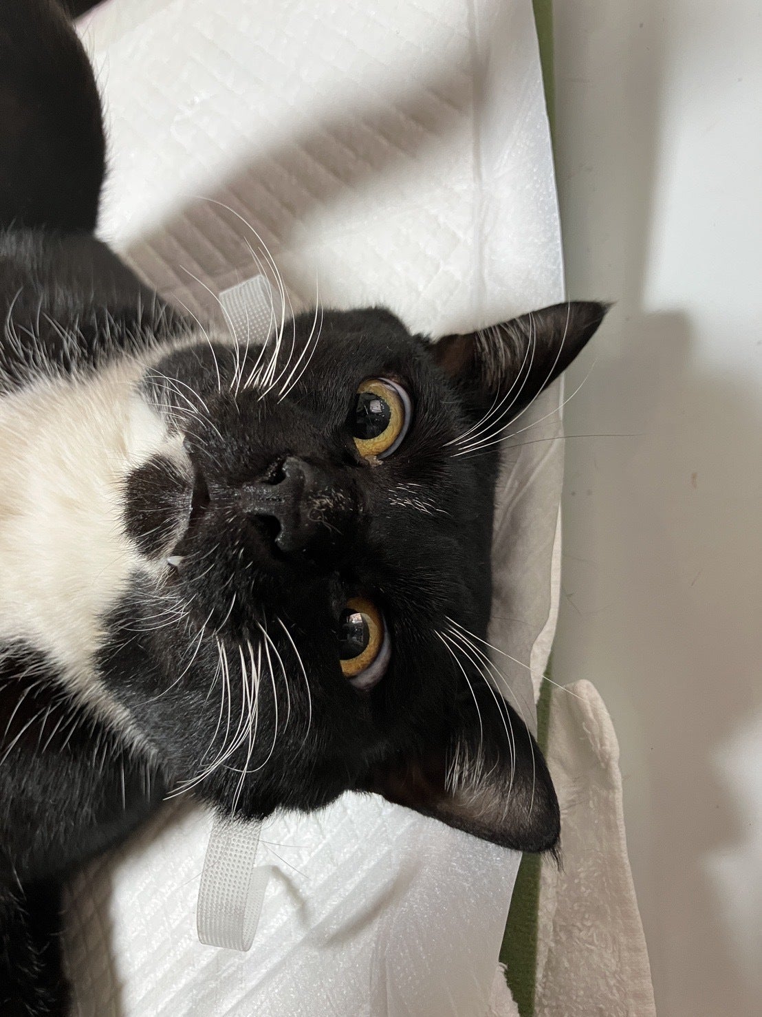 保護した当時のボロボロ猫です。成猫ながら体重は1.6キロ、身体中に内出血と左足にゲガ、43日間の長い入院生活も無事に退院。エイズキャリアで口内炎持ち。抗生物質と痛み止めで2週間おきに病院へ。痛み止めも効かなくなり、抜糸の手術となり高額になりました。毎月のカード払いも厳しい状況です。助けたい命があってもお金と相談では一生悔いが残ります。もちろん全ての猫を助けることはできません。「目の前の猫ちゃんだけでも救いの手を差し伸べたい!」「助けられる命は助けたい!」と思っています。猫ちゃん達は暑さ寒さの中で必死に耐えながら、毎日のご飯にもありつけるかどうかの環境にいます。猫ちゃん達はあなたの温かい手を待っていますまだ、口内炎のよだれが出ています。