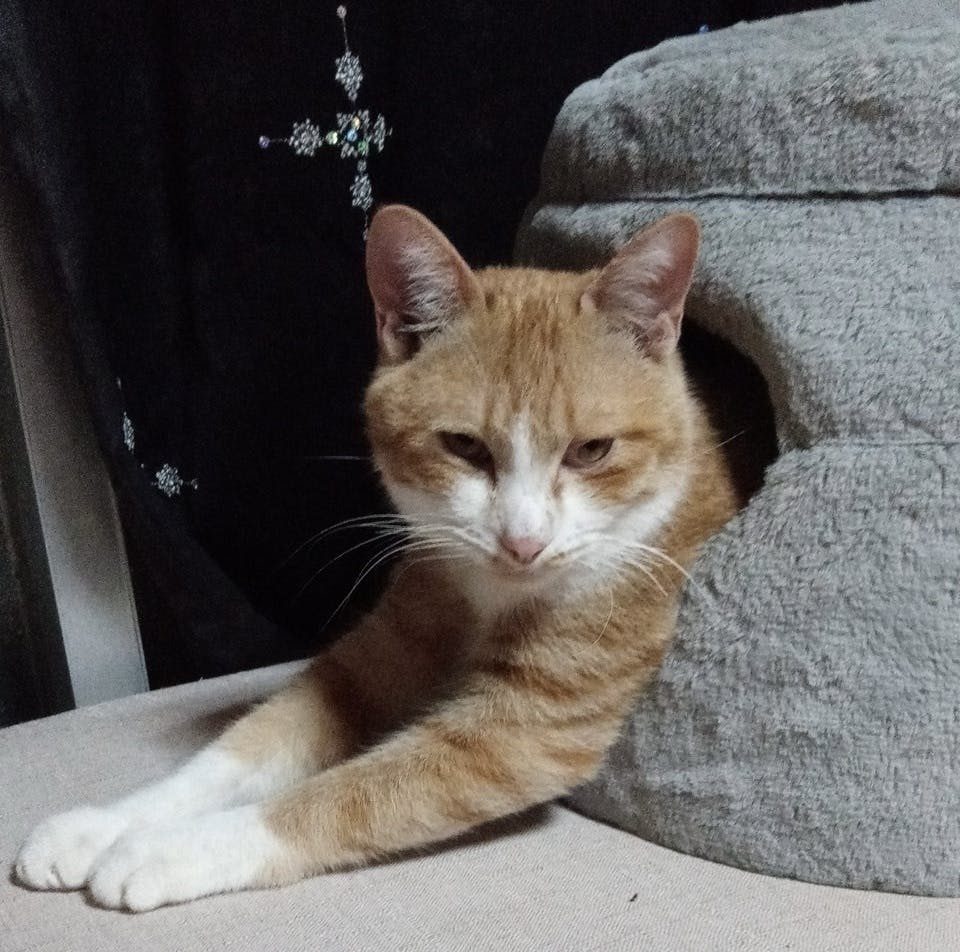 三匹目は里親様の所で発症。里親様により治療をして頂き、回復しました。同じ兄弟なので引き取りたいと申し出でを頂き、昨年7月譲渡になりました。