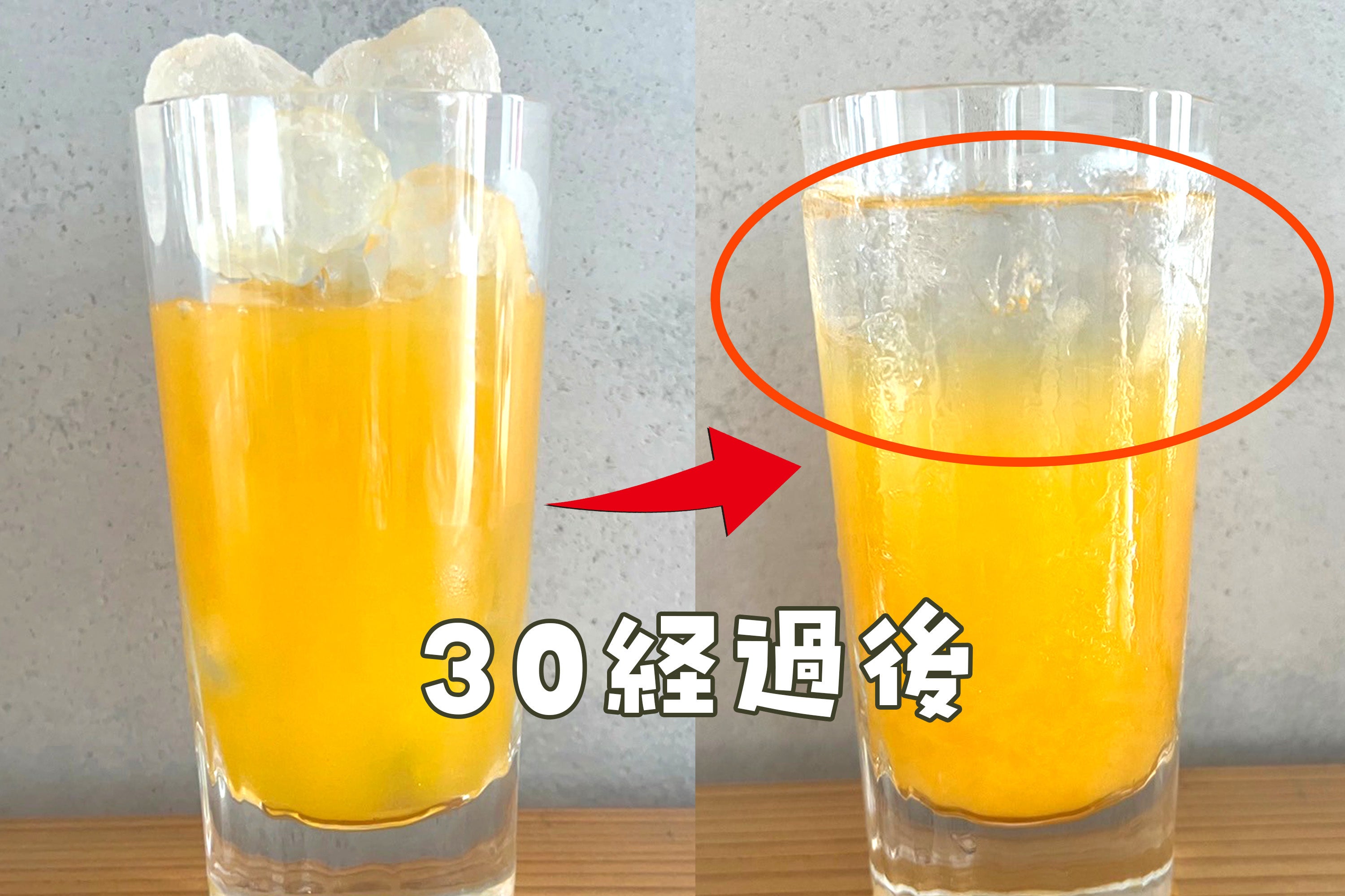 従来の氷: 氷が溶けることでドリンクが薄まり、味わいが損なわれる…