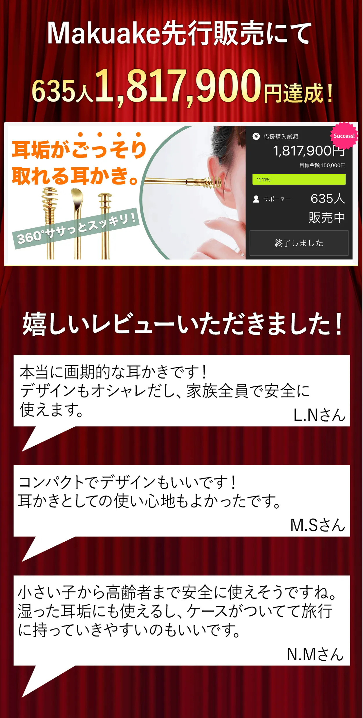 2025/05/01 00:09ご支援者様、全方位死角なし!サッと撫でるだけで耳垢ごっそり。らくらく耳かき♪にご興味をお持ちいただきありがとうございます。プロジェクト開始から39日目で32人ものご支援者の方々より支援頂き、無事プロジェクト終了を迎えることが出来ました。早速皆様のリターンを2025年05月末にお届けできるよう準備を始めております!皆様にご満足いただけるリターンをお届けできるよう、全力で取り組んで参りますので引き続き、「全方位死角なし!サッと撫でるだけで耳垢ごっそり。らくらく耳かき♪」をよろしくお願い致します。BRIGHTチーム もっと見る