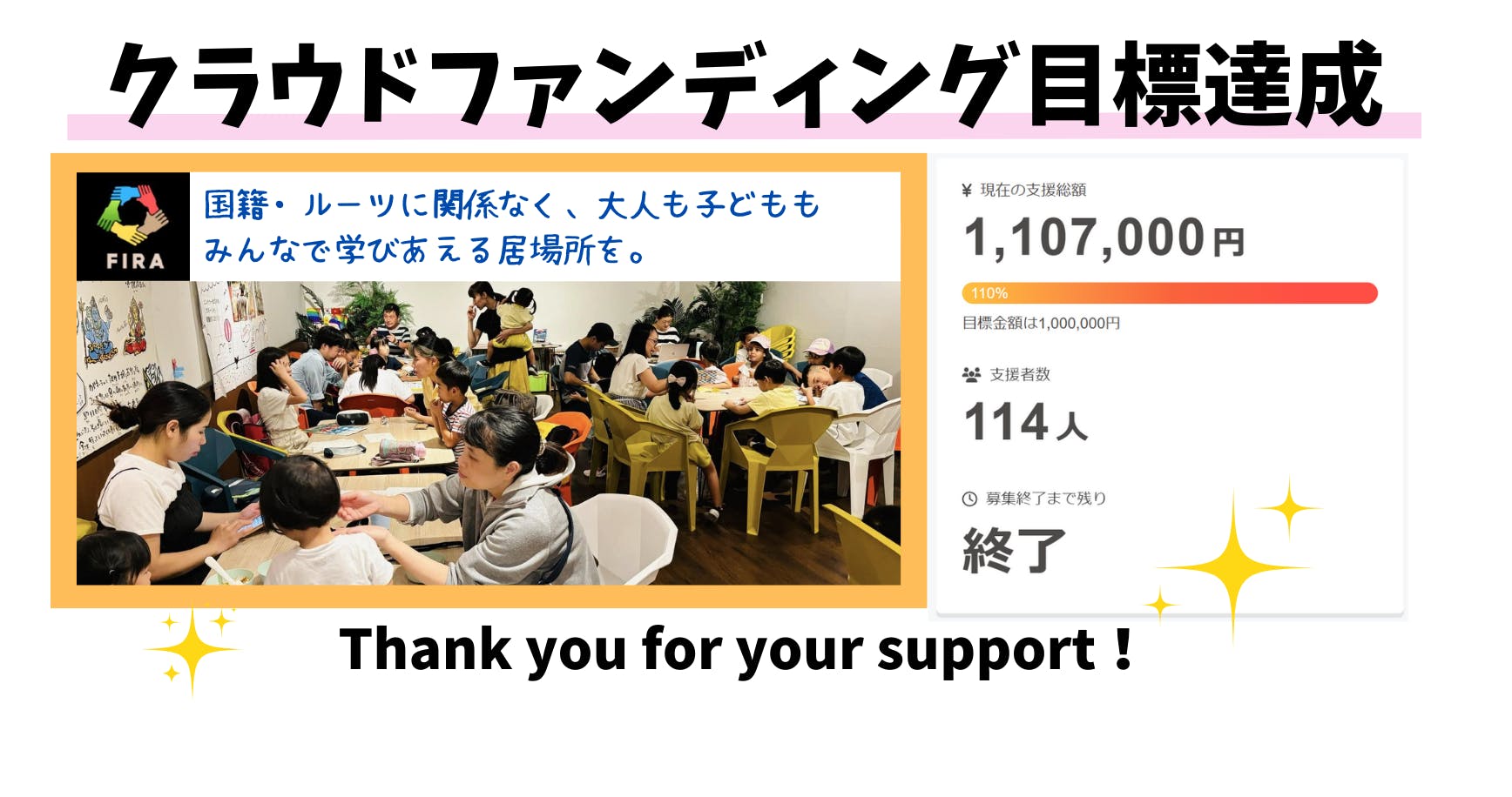 寄付してくださった方だけでなく、プロジェクトの周知にご協力いただいた方、様々な交流の機会にFIRAを呼んでくださった方、活動の協力をしたりサポートをしてくださる機関・団体の方、子どもの明るい未来を一緒につくっていきたいと活動してくれる外国ルーツの家族、スタッフや見学に来た人までも元気にしてくれる子どもたち、FIRAをいつも支えてくれるスタッフ、多くの人に支えられて達成できたゴールです。改めて御礼申し上げます。
