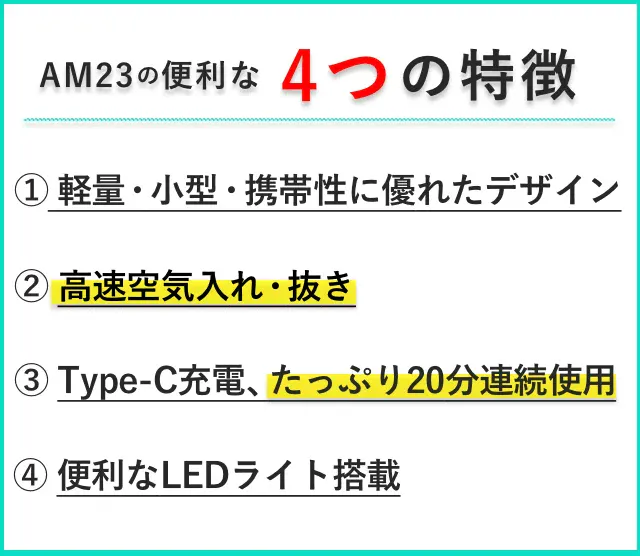 送風量は毎分180L、膨張圧は3.5kPaです。 AM23 は空気を入れるor抜いて使用する製品、例えばエアマットレス、エアソファーや枕、プールにピッタリです。AM23に作業は任せて、あなたはのんびり木陰の下で、心地よい時を楽しんで下さい。