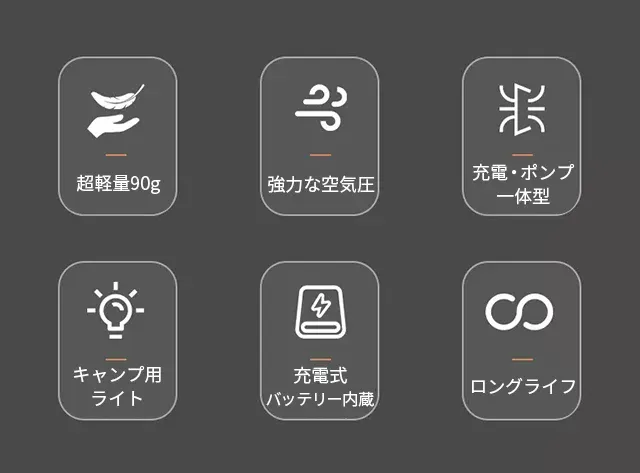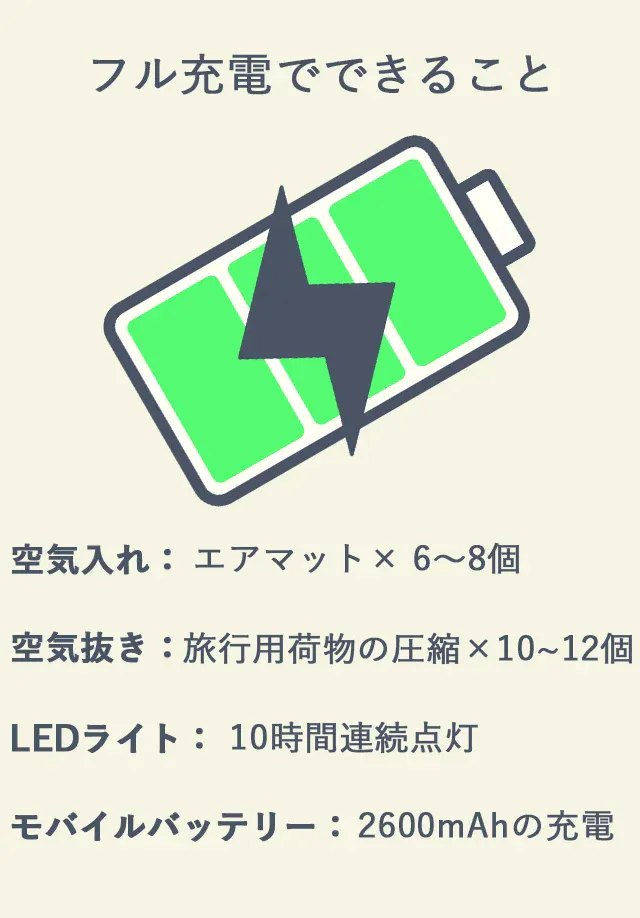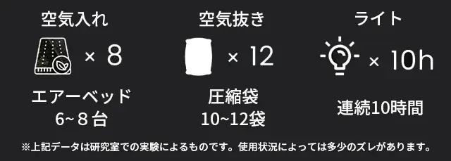 1回のフル充電で、衣類を12回圧縮、エアマットレスを8回膨らませることができ、暗闇を10時間照らすことも可能です。