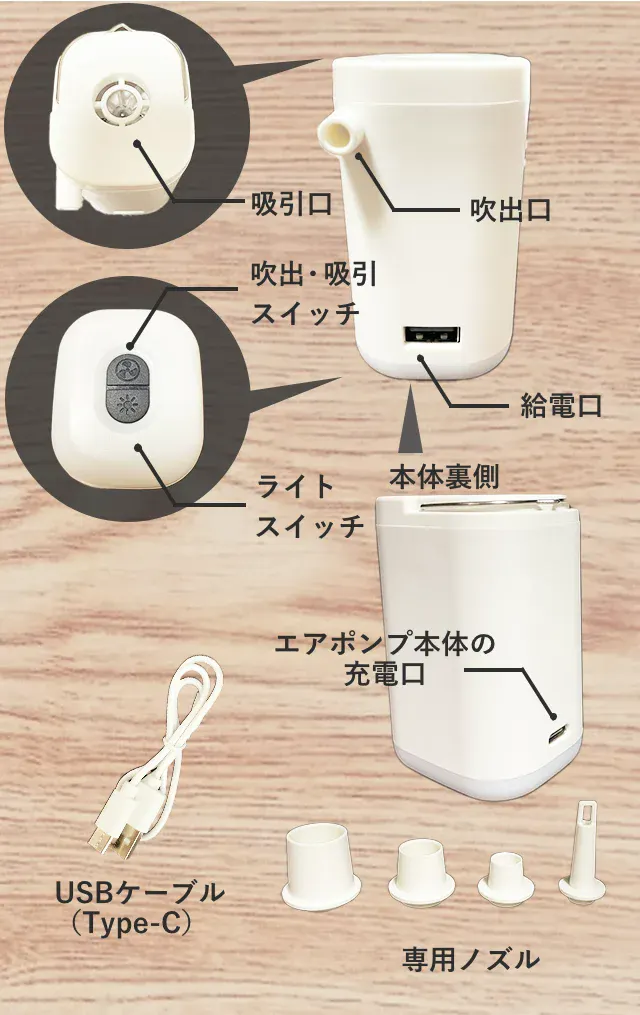「AM23」は本体上面に空気吸引口、側面に送風口、底面にライトを備え、スイッチを押すだけで誰でも簡単に使えます。