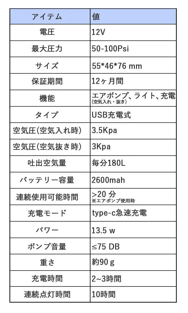 2600mAh大容量バッテリーのおかげで、エアポンプは20分連続使用が可能です。