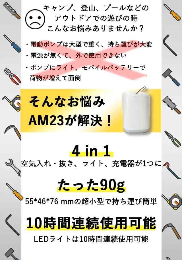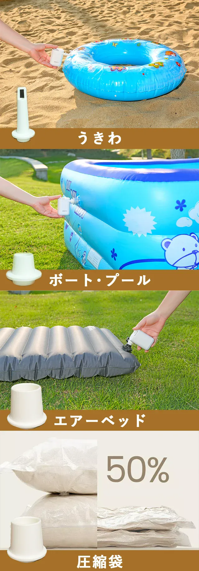 キャンプだけでなく、お子様と一緒にアウトドアを楽しむ際にもAM23をご利用ください。浮き輪やボール、プールを簡単に膨らませることができます。暑い夏を楽しむにもピッタリのアイテムです。