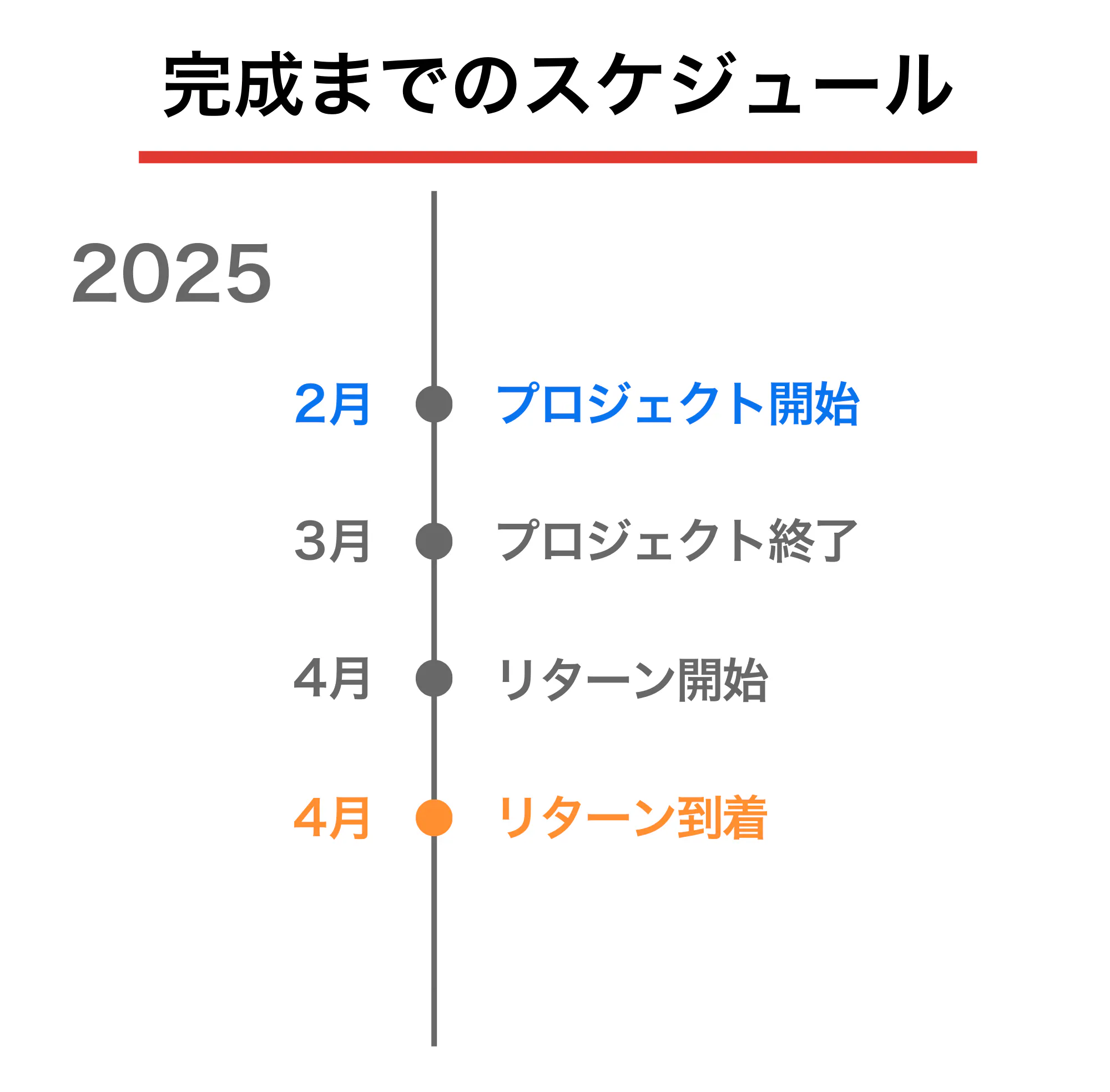 ※本文中に記載させていただいたスケジュールは、あくまでプロジェクト公開時点の予定です。クラウドファンディングを経て輸入を行う性質上、配送遅延のおそれがございます。