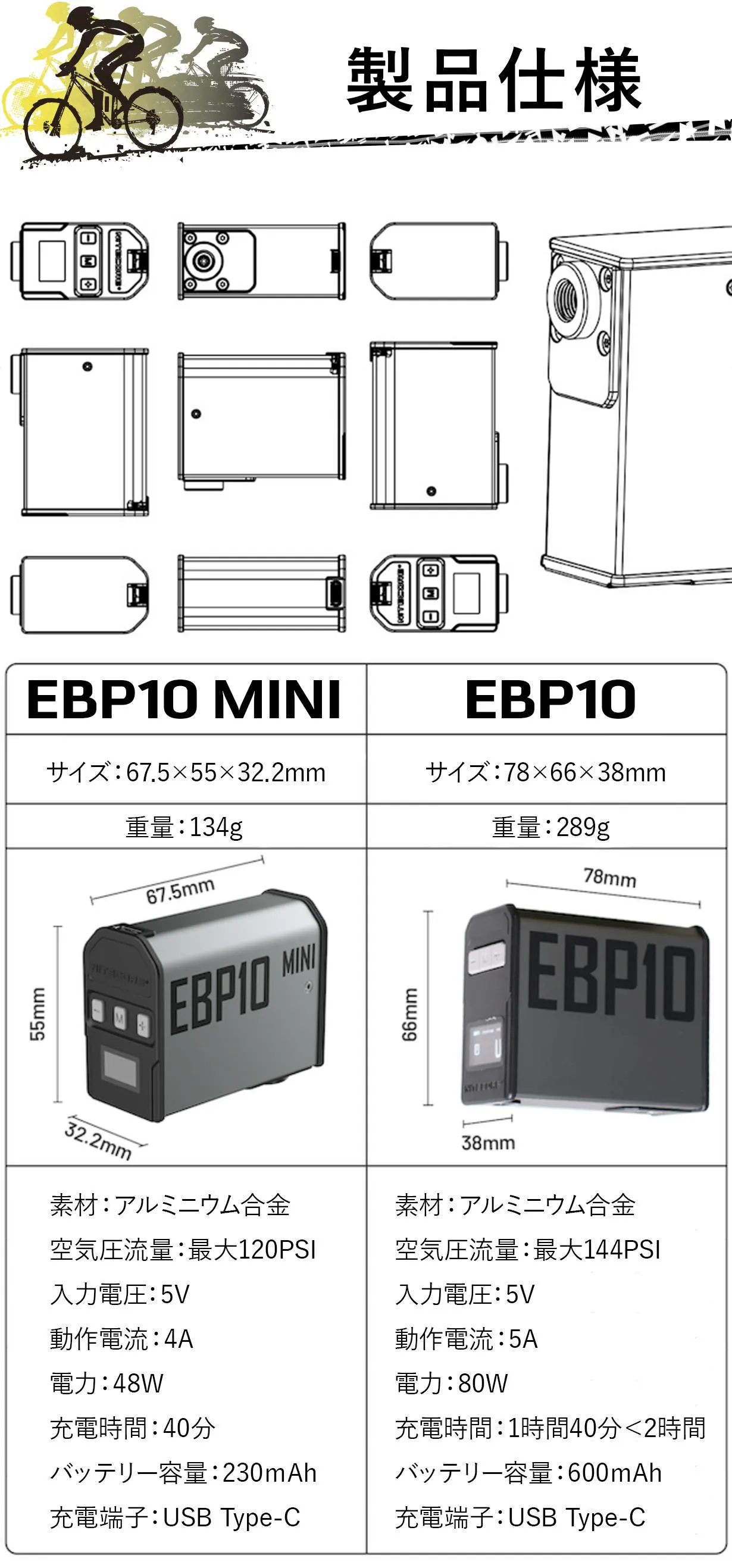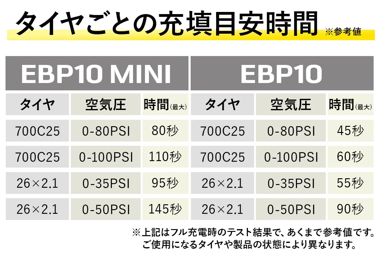 フルパワーで使用すると、EBP10 MINIは700C25のタイヤを0から80PSIまで2本充填できます。パワーが必要なマウンテンバイクやBMXのタイヤも充填できます。