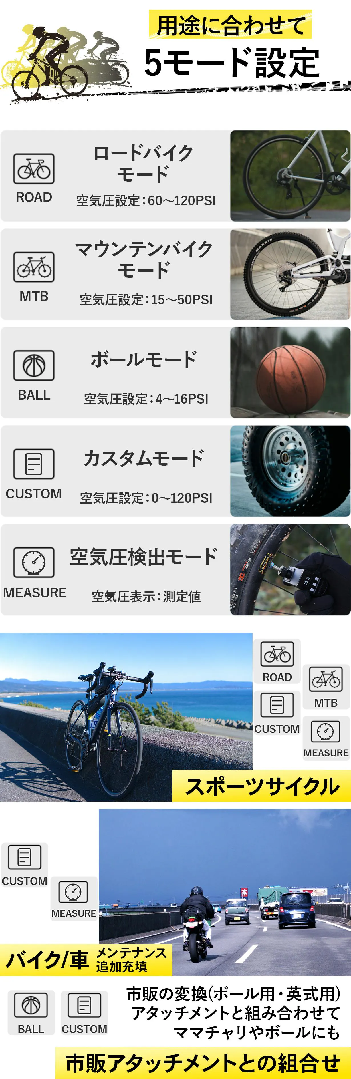 さらに市販のバルブ変換アタッチメントを組み合わせれば、ママチャリなどの普通の自転車や、スポーツボールにも空気を入れられます!
