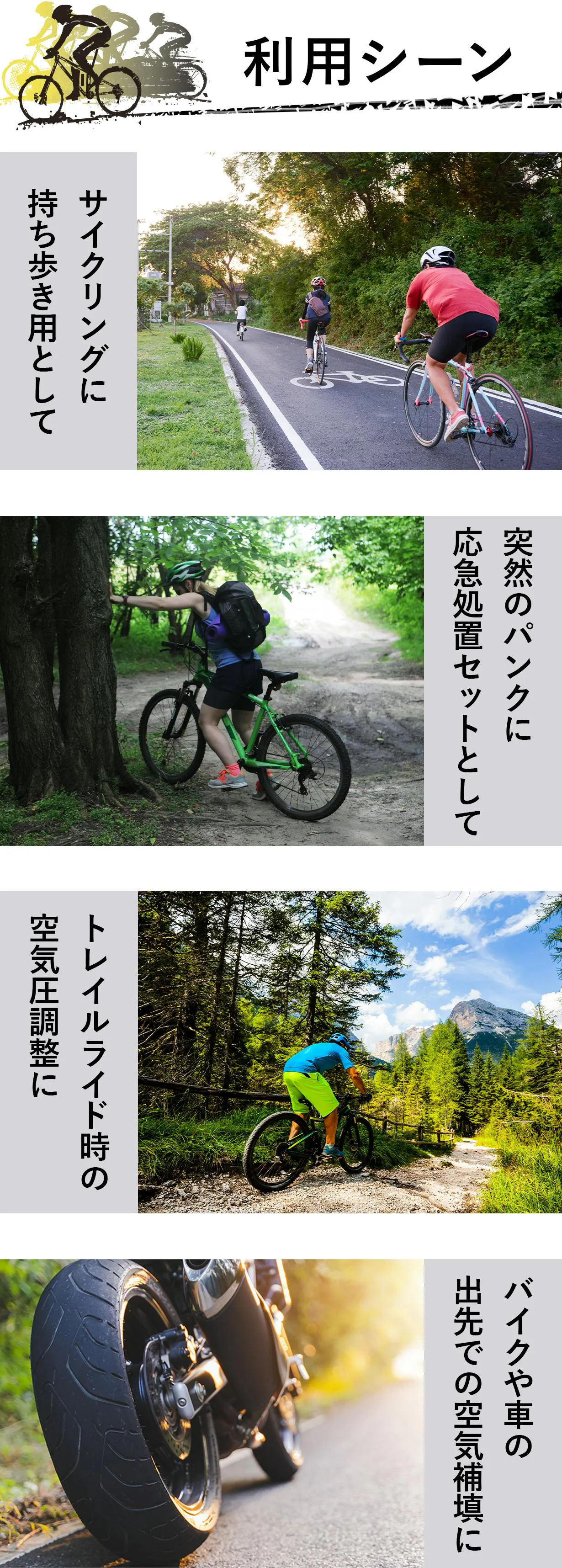 さらに自動車やバイクのタイヤメンテナンスにも使用できます。高速道路に入る前に、ちょっとだけ空気を補充しておきたい…!そんな時にも便利です!※ゼロからのフル充填はできません。