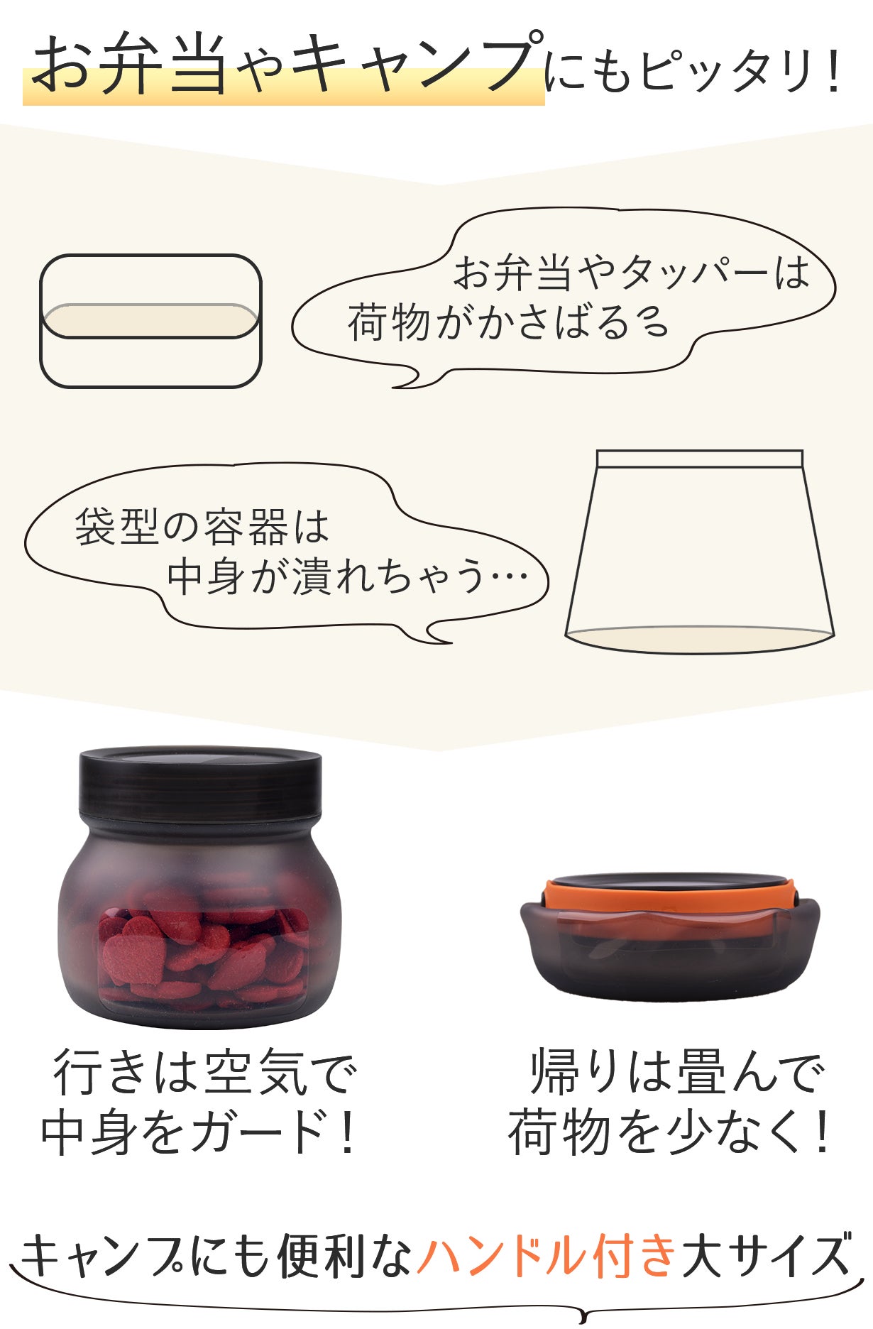 キャンプや持ち運び時に中身に圧をかけずにハンドルで持ち運び!ハンドルが不要になれば取り外してスッキリ収納できます。