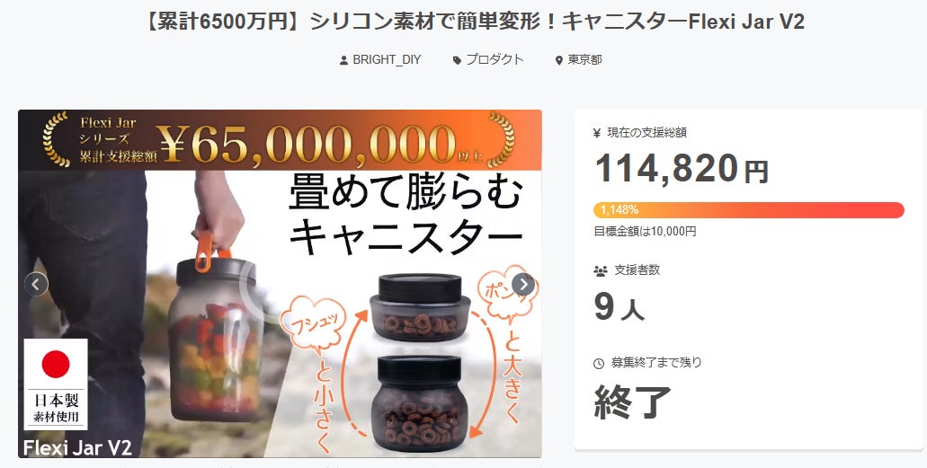 2025/05/01 00:18ご支援者様、【累計6500万円】シリコン素材で簡単変形!キャニスターFlexi Jar V2にご興味をお持ちいただきありがとうございます。プロジェクト開始から32日目で9人ものご支援者の方々より支援頂き、無事プロジェクト終了を迎えることが出来ました。早速皆様のリターンを2025年05月末にお届けできるよう準備を始めております!皆様にご満足いただけるリターンをお届けできるよう、全力で取り組んで参りますので引き続き、「【累計6500万円】シリコン素材で簡単変形!キャニスターFlexi Jar V2」をよろしくお願い致します。BRIGHTチーム もっと見る