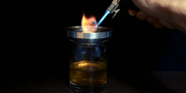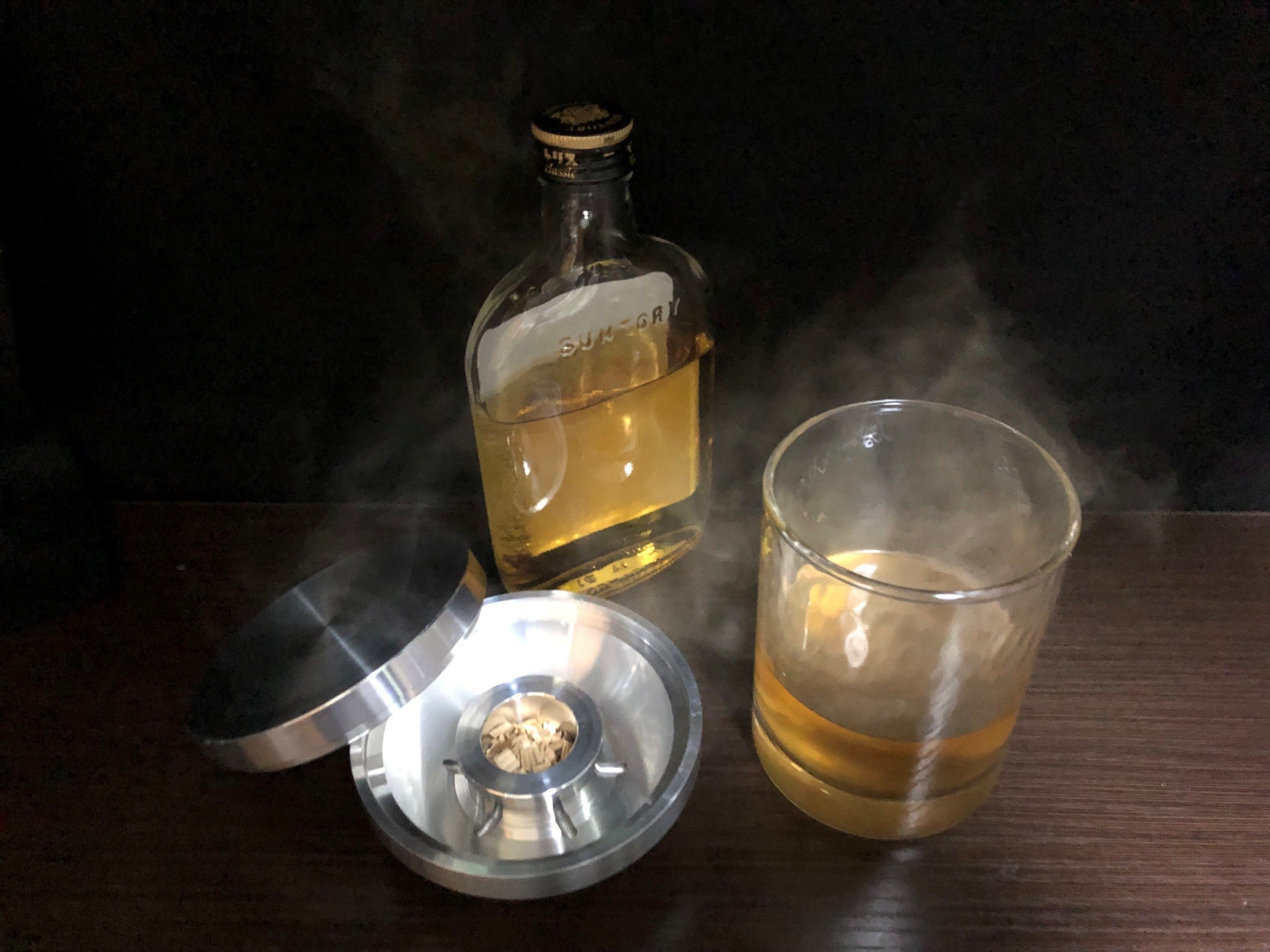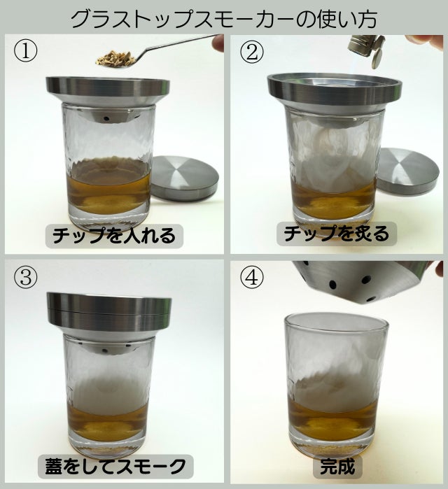 チップを火で炙る時、燻煙はグラスから流出しないので、効率よくお酒と混ざり合う。燻煙がグラス外に出ないので部屋の匂いも気にならない。