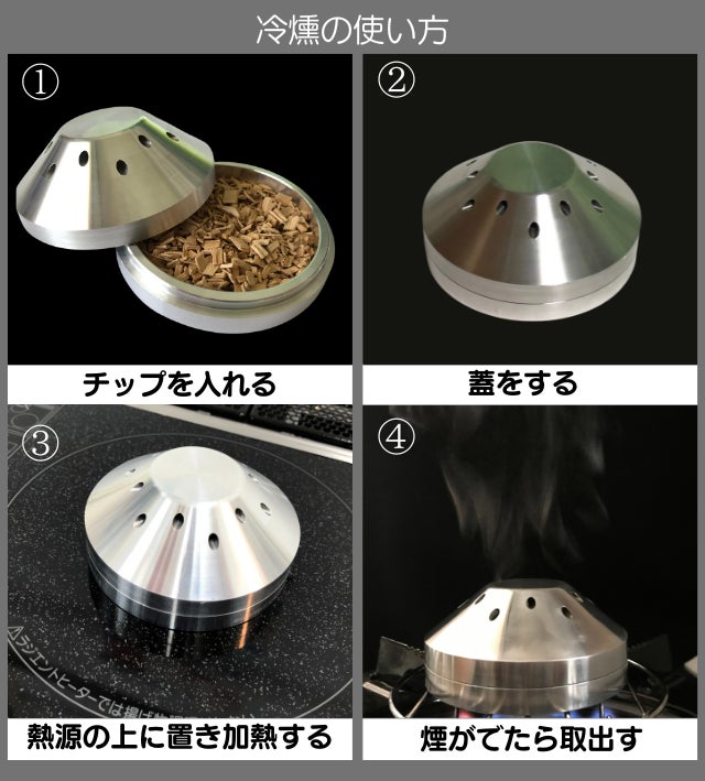 【Multi Smoker】にチップを入れて熱を加えるだけで手軽に冷燻料理。熱源は電気コンロ、IH、そしてガスコンロなど。