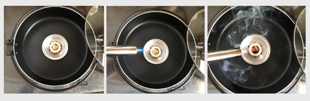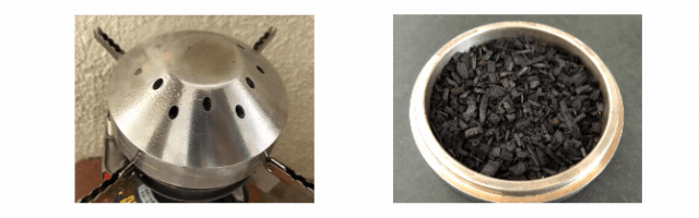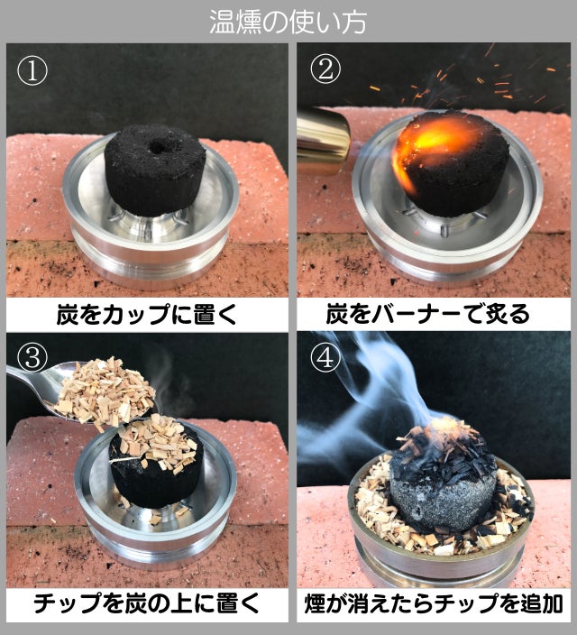 カップにチップを5-10g入れて蓋をし、熱源を加え煙が出始めたら準備完了。
