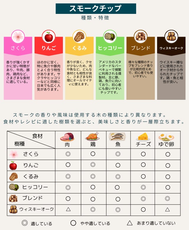 食材とスモークチップのアレンジを変えるだけで、香りや燻した時の色付きが異なります。自分好みのスモークチップを見つけてより美味しい燻製を楽しんでください。