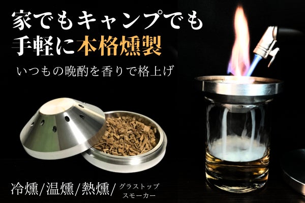 今回ご紹介させて頂くのは、グラスの上でお酒を瞬間燻製して美味しくし、キャンプ用バーナーはもちろん、トースターやグリル、ガスコンロ、IHクッキングヒーターなどで手軽に燻製が出来るスモーカーです。