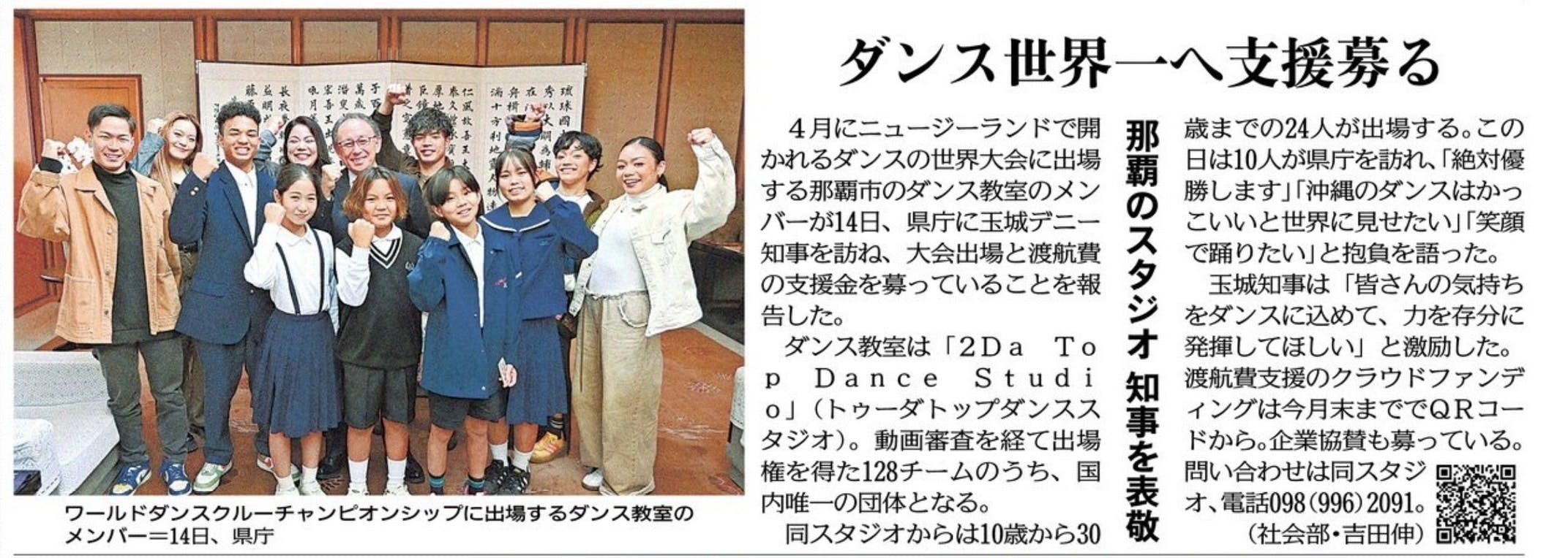 2025/02/15 22:17【クラウドファンディング活動報告】沖縄タイムスさんが、2月14日の沖縄県知事表敬訪問の記事を掲載してくれました!沖縄タイムスに2日連続で取り上げていただけたこと、心から感謝しています。多くの方々に私たちの活動を知っていただける機会となり、さらに頑張る力が湧いてきました。しかし、まだまだ支援が必要です。目標達成に向けて、引き続き皆さまの応援をお願い申し上げます。共に夢を実現するために、どうか力を貸してください。これからも全力で進んでいきますので、応援のほどよろしくお願いします。 もっと見る