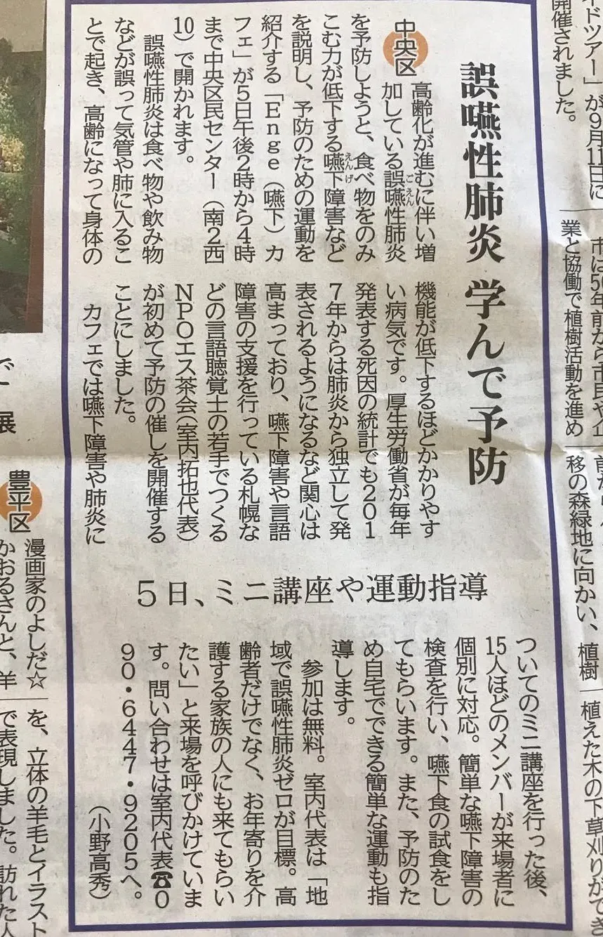 お互い言語聴覚士として病院や訪問看護ステーション、養成校の教員など10年以上様々な分野で経験を積みながら現在も業務中です。2016年に自ら立ち上げた任意団体『エス茶会』の活動を続けていく中で、札幌市内で実施した健康教室で100名以上の参加者を集め、高齢者やそのご家族の健康意識の高さを実感すると共に健康で暮らし続けるための予防活動の重要性に気が付きました。