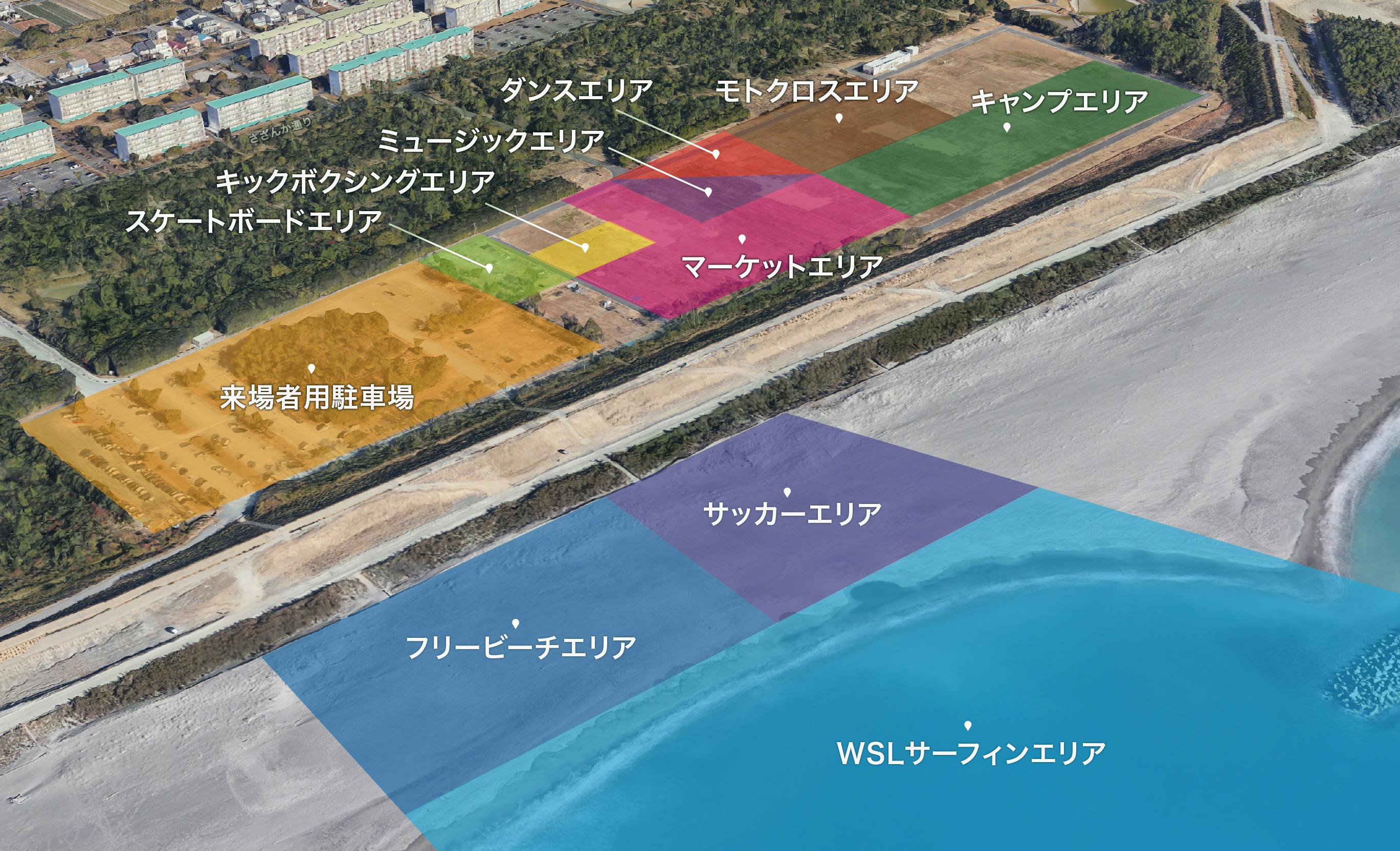 内容:ビーチ及び隣接広場での各種スポーツ大会、スクール等の参加型アクティビティ、キャンピング、ミュージックライヴ、トークショー、衣類・雑貨・飲食 (酒類含) 等の販売
