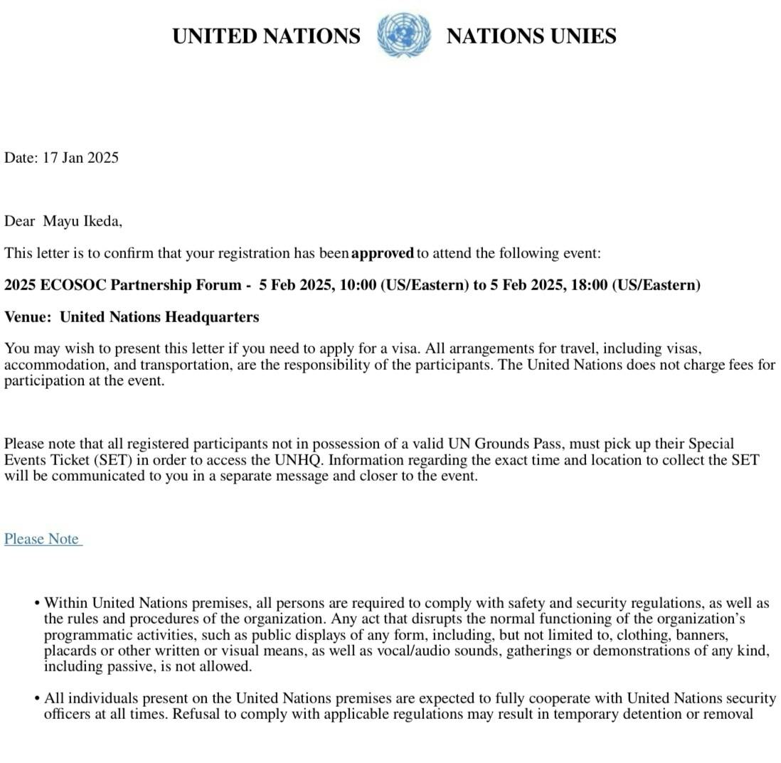 また、ニューヨーク国連本部会議にMakoto Okubo氏が代表を務めるMusic for SDGsのDirector of Digital Artとして、2/4、2/5は招待出席させていただきます。
