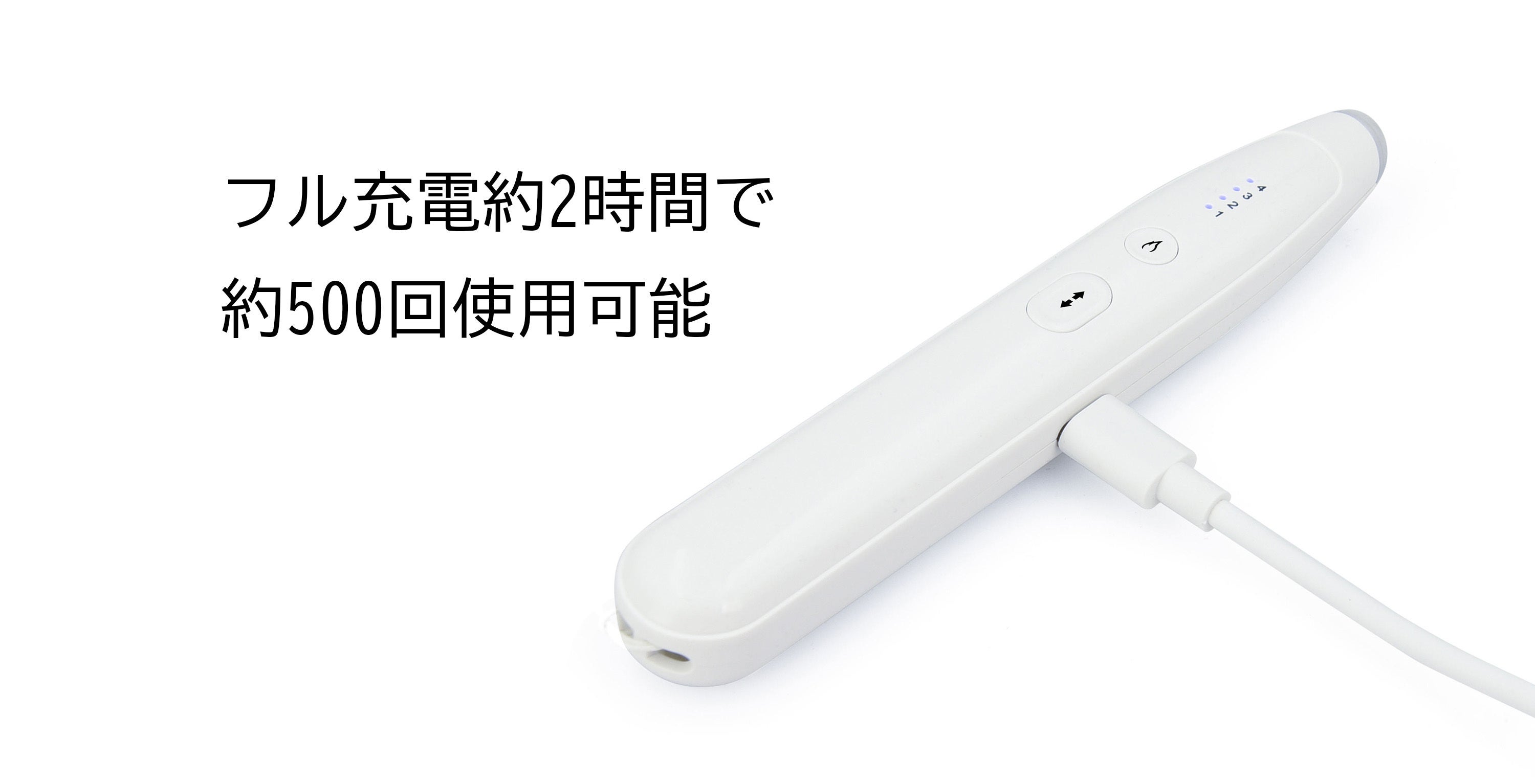 製品にはUSB-TypeC充電ケーブルが付属しています。約2時間でフル充電が可能です。フル充電で約5回以上使用できます。