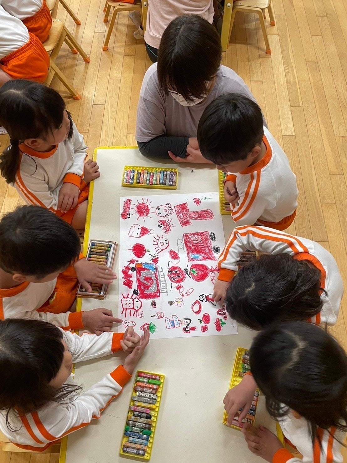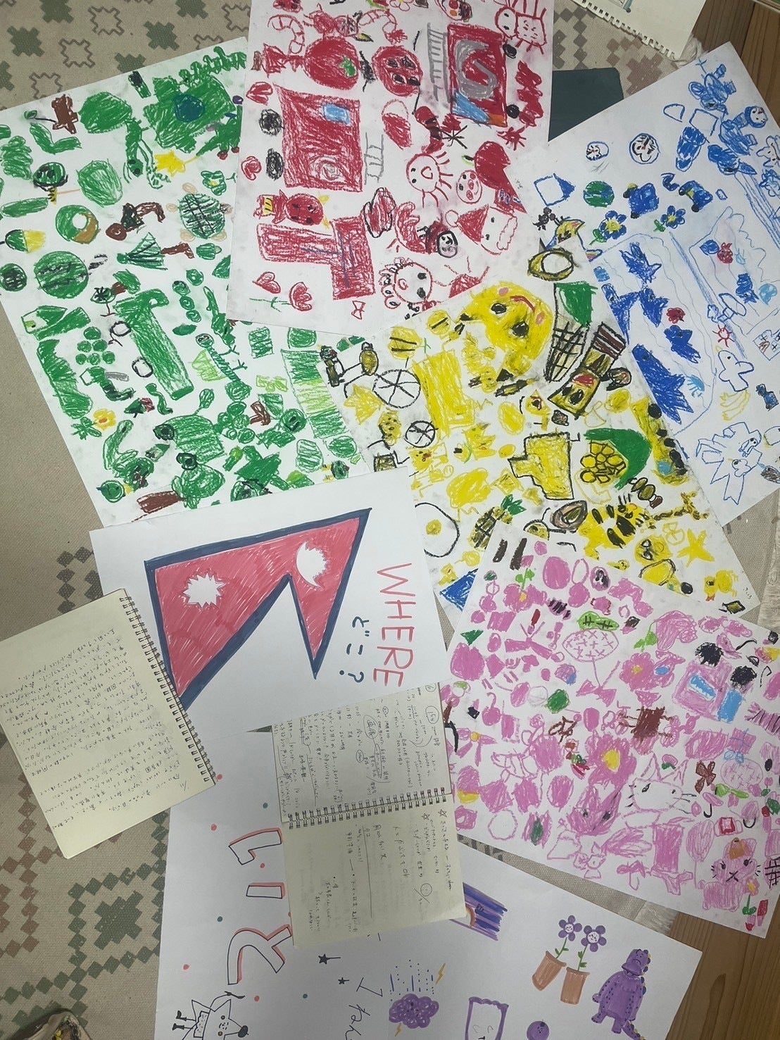 お互いの作品を見せ合い、似ている部分や、各国ならではの発想の違いを発見することができました。言語が異なっていても、絵を通して楽しく会話する姿はとても素敵で、心温まる交流となりました。クラウドファンディングで応援してくださった皆様、ネパールで協力してくださった先生方々、日本での進行を計画してくださった保育園の先生方々、そして気持ちよく参加してくれた子ども達に感謝申し上げます。