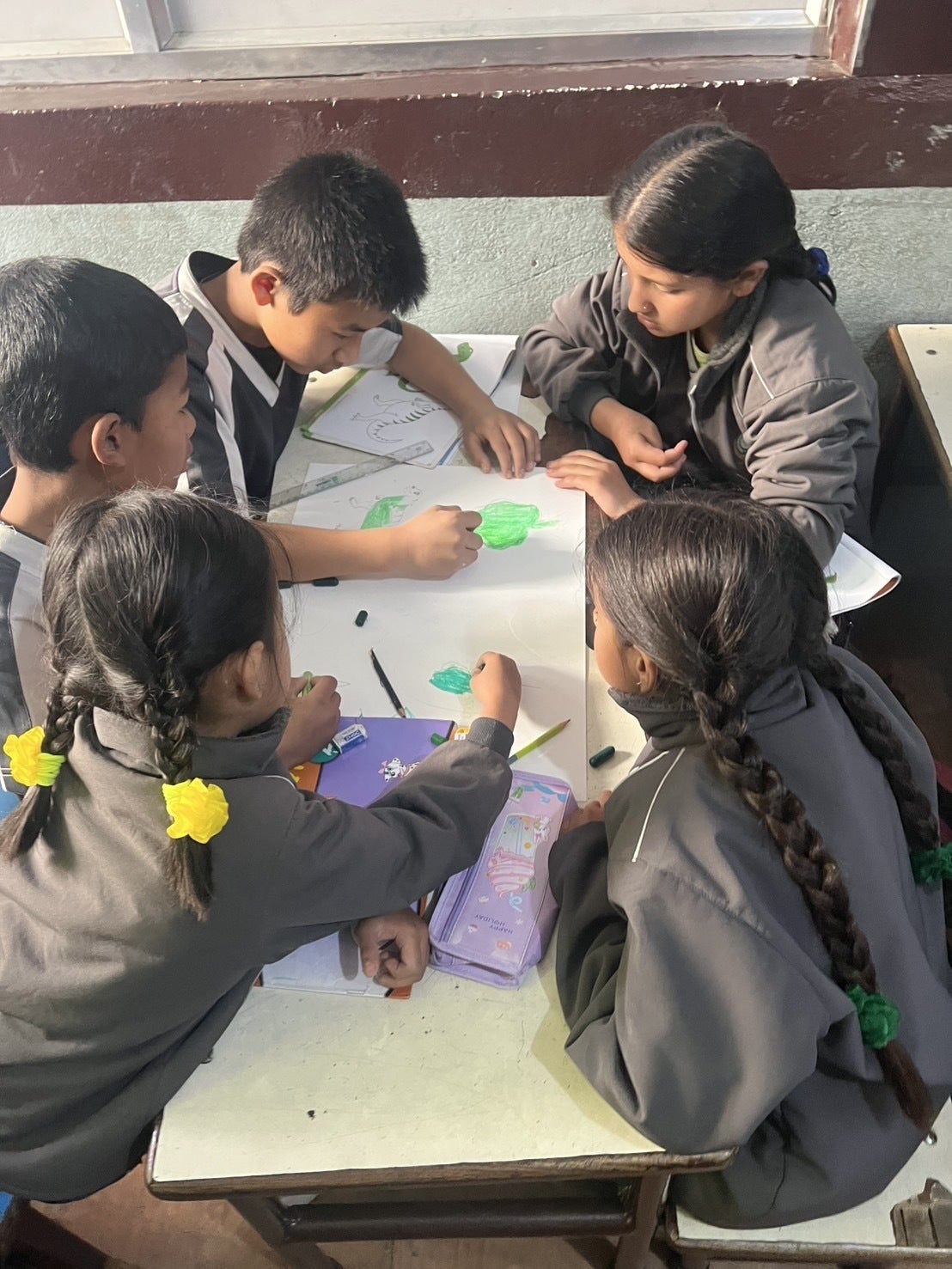 具体的には、ネパールと日本で共通する青、赤、黄色、緑、ピンクの5色をテーマに、各チームに一色ずつ割り当て、それをもとに画用紙いっぱいに自由に絵を描いてもらいました。