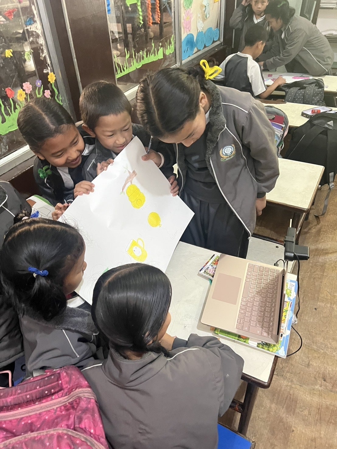 ネパールの子ども達(小学1年生から2年生約20名)にとって、他国の子ども達と話す機会はもちろん初めてではじめは緊張した様子がありました。しかし、絵を描き進め自分なりの考えを日本の仲間に共有していくうちに、緊張がほぐれ楽しそうに画面を通して交流することができていました。