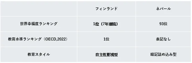 何も根拠や論拠がない状態でこのプロジェクトを作っているわけではありません。世界幸福度ランキングで7年連続1位のフィンランドをはじめとした北欧の教育の仕組みを参照し、本授業を作っています。北欧諸国はヨーロッパの中でも教育の質が高いことが有名で、OECDが行う調査においても常に上位にランクインしています。(日本の世界幸福度ランキングは全体の53位でG7内では最下位です。)