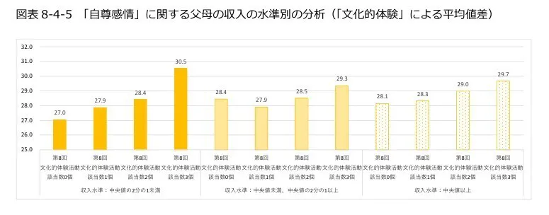 また、子ども達への新しい体験がもたらす効果は様々な場面で活きることが明らかになっています。文部科学省委託調査によると幼少期の体験学習は今後の自己肯定感や未来志向の値を正にする事が証明されています。(今回の取り組みは文化体験活動に分類しています。 )