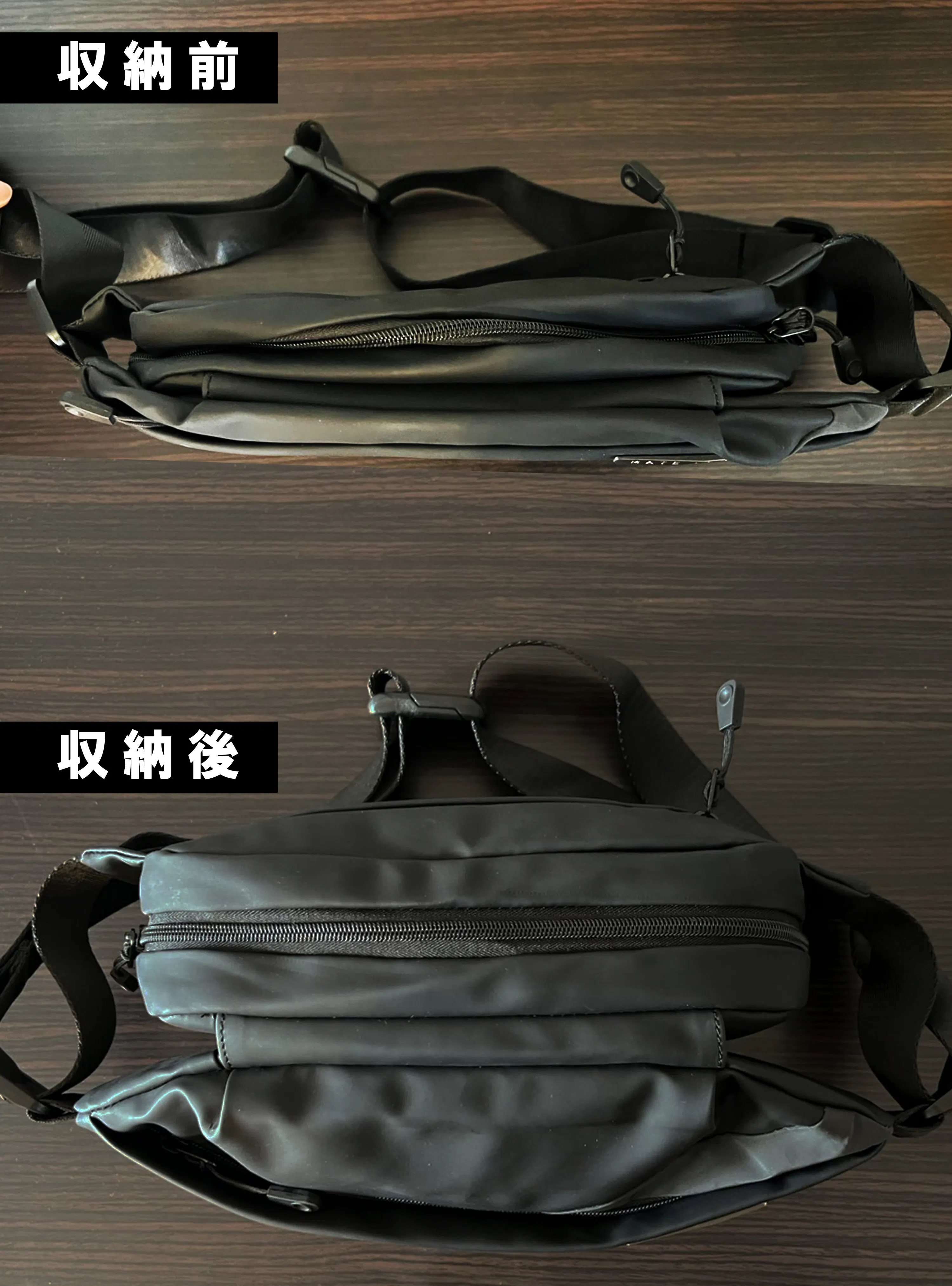 財布、スマホ、鍵、タブレットなどがスッキリ収まる容量
