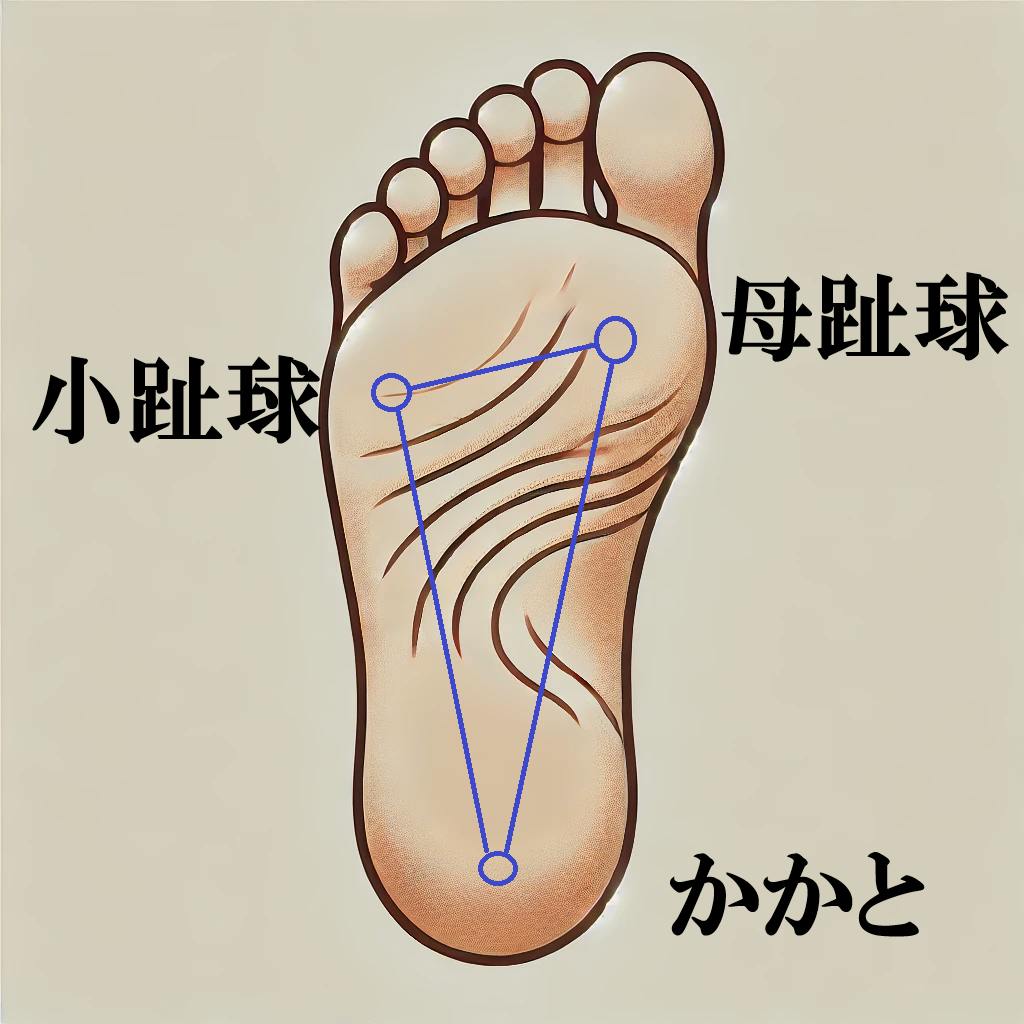 私たちの足は、かかと・母趾球(親指の付け根)・小趾球(小指の付け根)を結ぶ「三点バランス」 によって支えられています。このバランスが正常に機能することで、足にかかる 体重の約100% を適切に分散し、安定した歩行が可能になります。